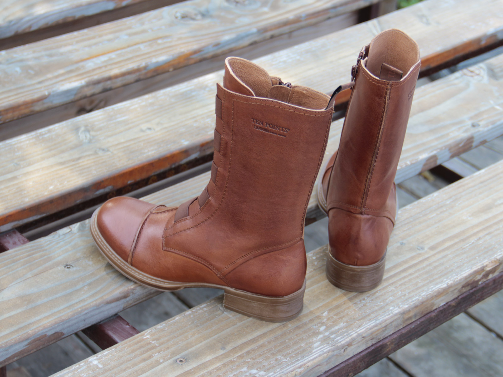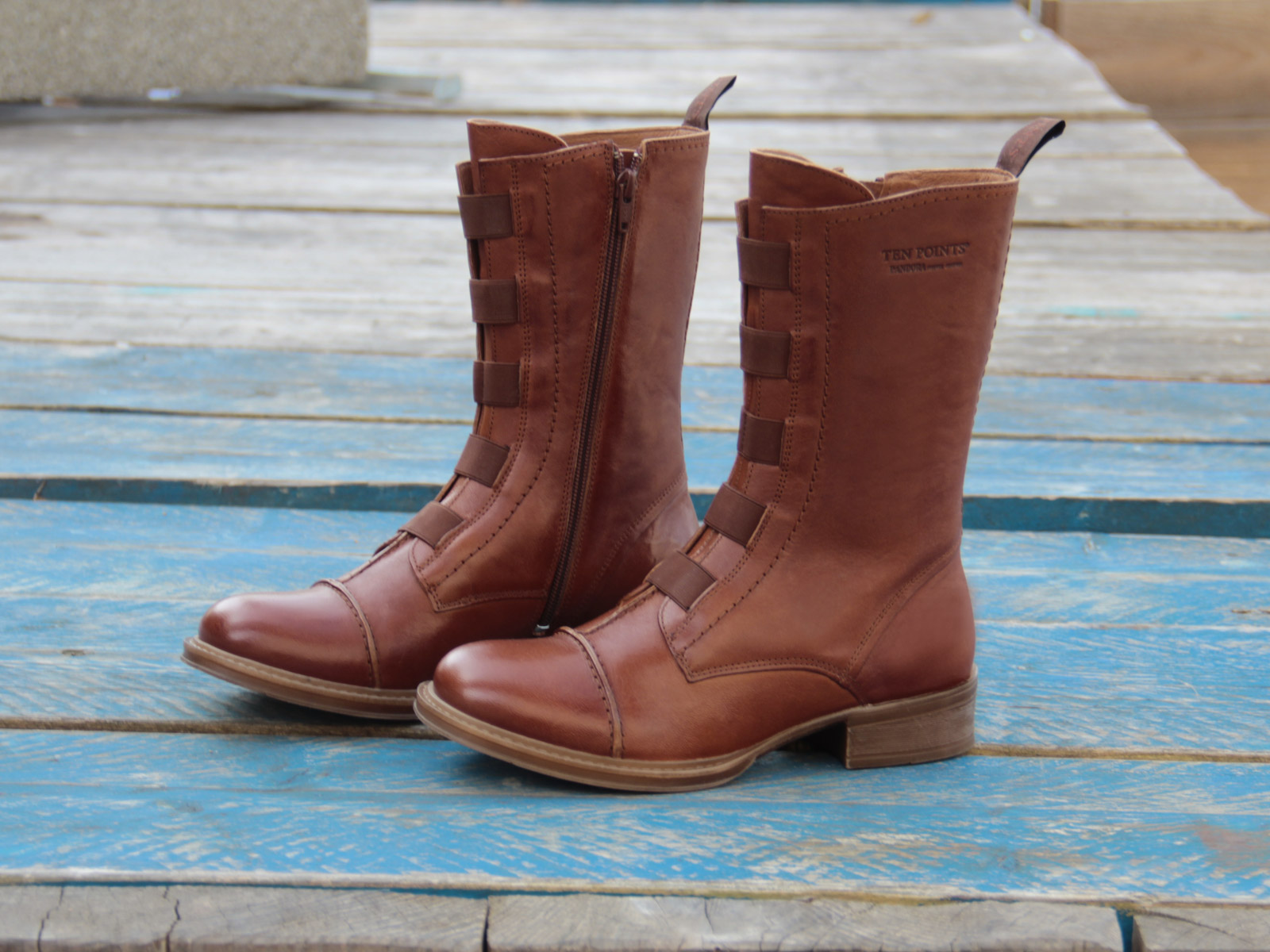Nachhaltiger, chromfreier Stiefel im Western-Stil Die neuen Schnürstiefel von Ten Points sind voll im Western-Style-Trend ohne wie ein Cowboy-Stiefel auszusehen. Mit ihrer klassischen und modischen Optik in ¾ Höhe sind sie ein Must-Have für Ihre Herbstgarderobe. Der Stiefel hat eine 6+2 Lochung, die für einen perfekten Sitz am Fuß sorgt. Der Reißverschluss an der Innenseite und die praktischen Anziehschlaufen erleichtern das An- und Ausziehen. Der Absatz ist ca. 3 cm hoch und die Sohle besteht aus Thermoplastischem Gummi. Die Schafthöhe beträgt ca. 22,5 cm, was optimal ist, um den Stiefel mit Röcken oder Kleidern zu kombinieren oder aber auch unter einer Jeans toll aussieht. Ten Points für die Herbstmode – eigenständig und authentisch Die Boots für Damen aus dem Ökoprogramm von Ten Points verbinden nachhaltige, chomfreie Materialien mit einem jungen, modernen skandinavischen Lebensgefühl. Die Stiefel überzeugen mit schönen Details, hohem Tragekomfort und natürlichem Leder das eine schöne Patina und eigenen Charakter entwickelt. Hergestellt werden die Schuhe in Portugal.