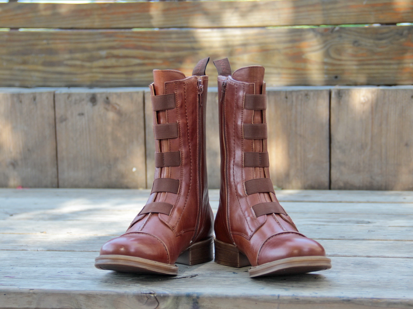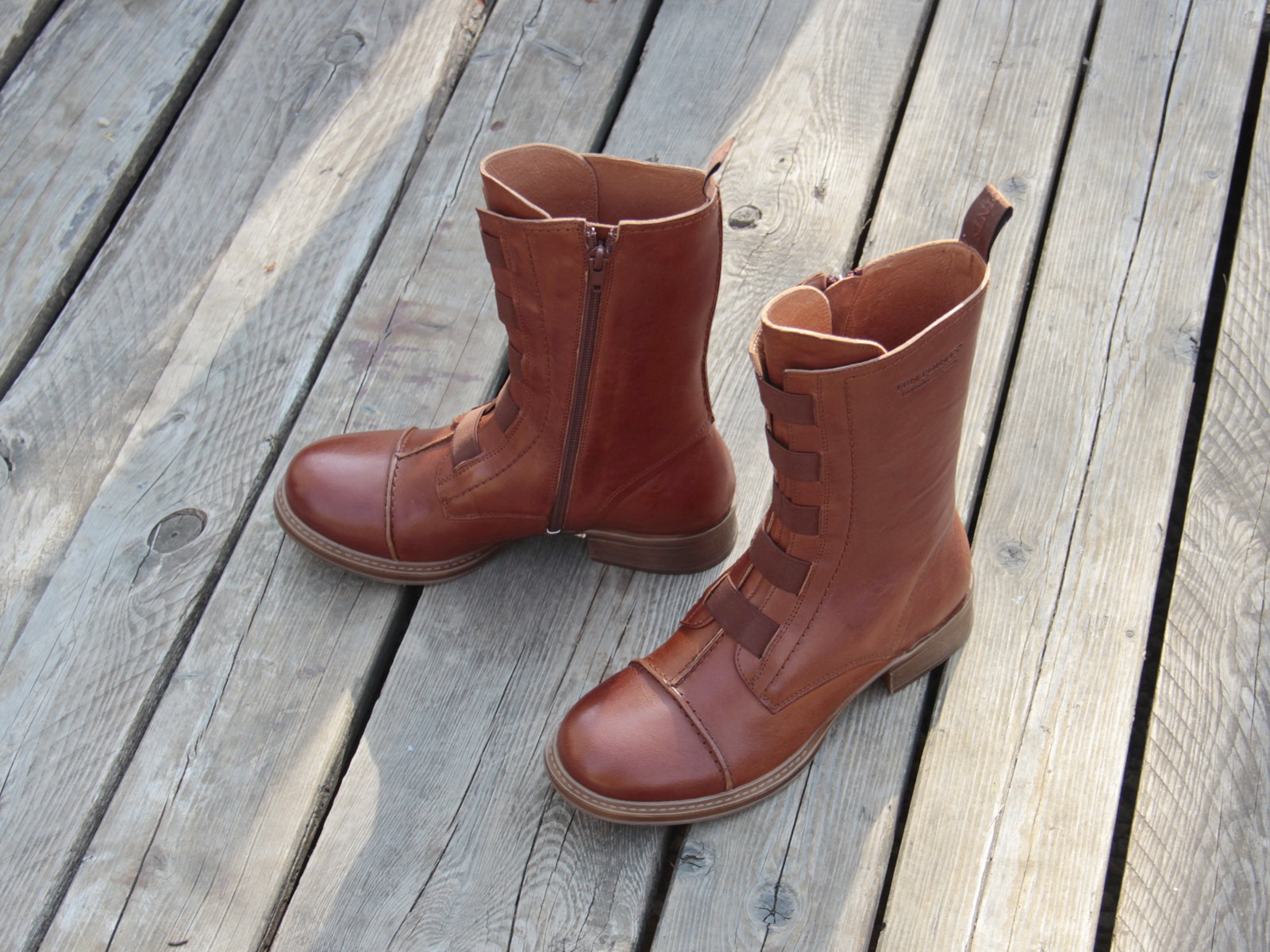 Besonders prägnant sind die dunklen Stretcheinsätze, die sich in der Weite anpassen und dem Fuß einen guten Halt geben. Das pflanzlich gegerbte Rindleder in der Farbe cognac wird in verschiedenen Techniken gewachst und gebürstet, um den speziellen Look von Struktur und Glanz zu bekommen.