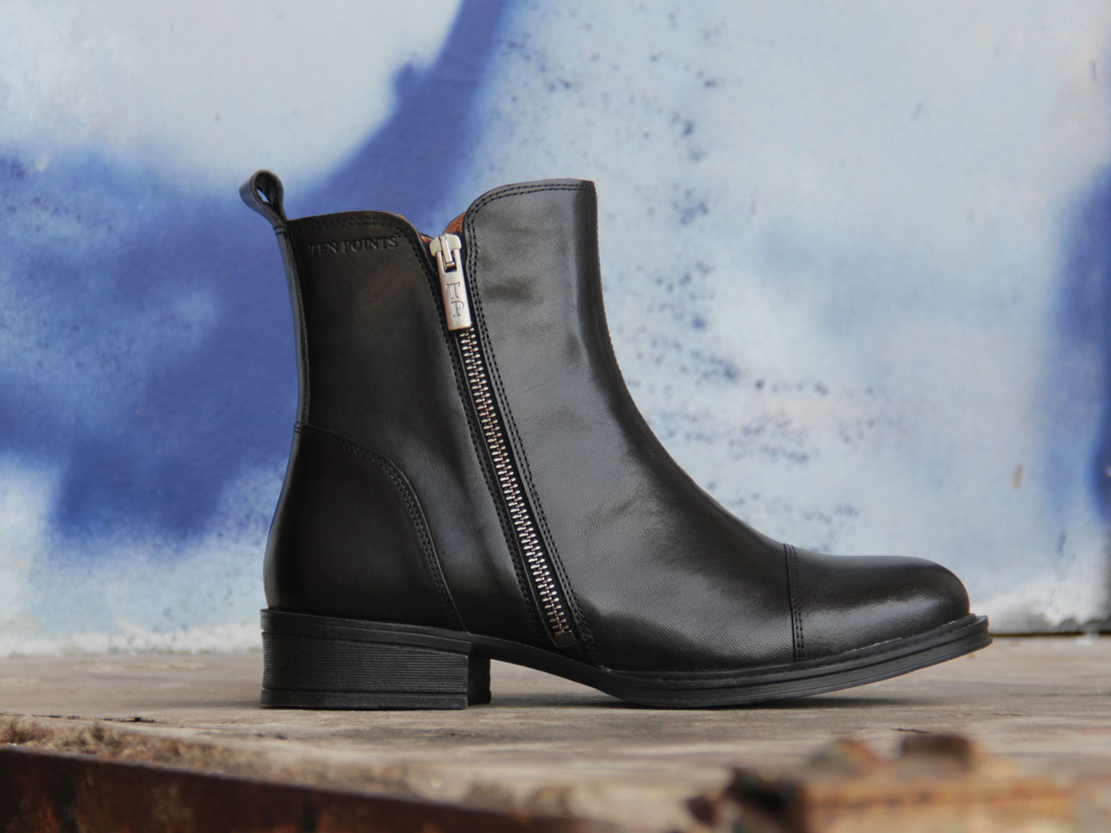 Nachhaltige Schuhe aus pflanzlich gegerbtem Naturleder Bequeme, warm gefütterte Stiefelette aus dem Ökoprogramm von Ten Points. Auch mit dem neuen Herbstprogramm schafft der schwedische Hersteller wieder sehr entspannt die Verbindung von Eleganz und nordischer Lässigkeit, von modernem Design mit zeitloser Optik. SILJE ist aus pflanzlich gegerbtem Glattleder. Für den besonderen Look von Struktur und Glanz wird das Leder in verschiedenen Techniken gewachst und gebürstet. Die Verarbeitung ist hochwertig, mit schönen Details und prägnanten Ziernähten. Die gepolsterte Innensohle ist mit weichem Futterleder bezogen, das Weblammfutter hält die Füße wohlig warm und sorgt dabei für ein atmungsaktives Klima im Schuh. Eine rutschhemmende Laufsohle aus Gummi gibt den nötigen Halt auch an ungemütlichen Herbst und Wintertagen. Die Absatzhöhe ist 3,5 cm. Ten Points Schuhe werden in Schweden entworfen und nachhaltig und unter fairen Bedingungen in Portugal gefertigt. Das Label steht für hochwertige Schuhmacherkunst mit Tradition, verbindet Funktionalität mit viel Komfort und setzt auf langlebige Materialien.