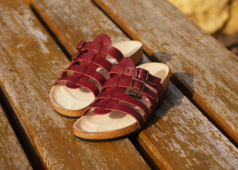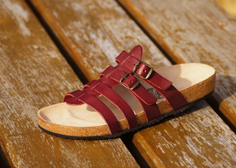 Bewährte und beliebte plfanzengegerbte Bio-Pantolette mit schmalen Riemen aus kräftigem Rindleder, mit leichter abriebfester Naturkautschuksohle und einem elastischen, lederbezogenen Fußbett, das Längs- und Quergewölbe des Fußes unterstützt.