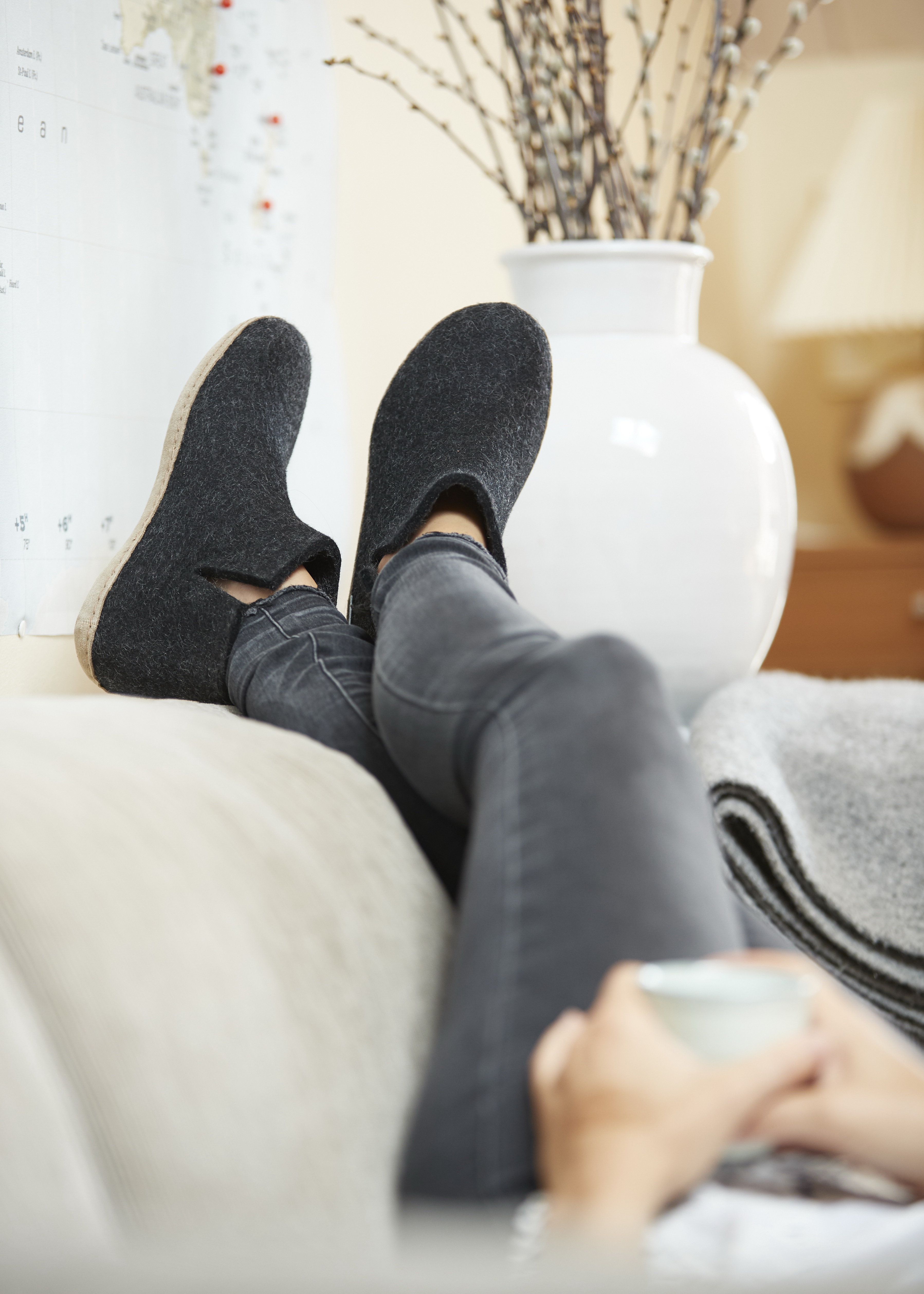 Glerups Pantoffel, Schuhe und Filzboots sind bekannt für ihren außergewöhnlichen Komfort. Bei der Herstellung wird eine weiche Wollmischung nicht chemisch, sondern natürlich und schonend behandelt. Die Wolle wird in weichem Wasser gewaschen, dann gekämmt und gefilzt. Der Filz wird zu Socken geformt, die für eine perfekte Passform dampfgefilzt werden, bevor weiche Sohlen aus chromfreiem Leder aufgeklebt und vernäht werden. So entstehen Schuhe, die nicht jucken und herrlich bequem und weich sind.