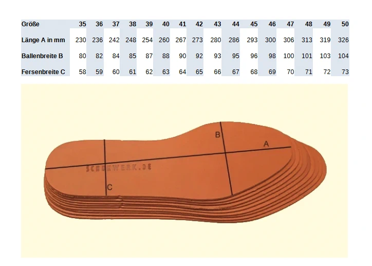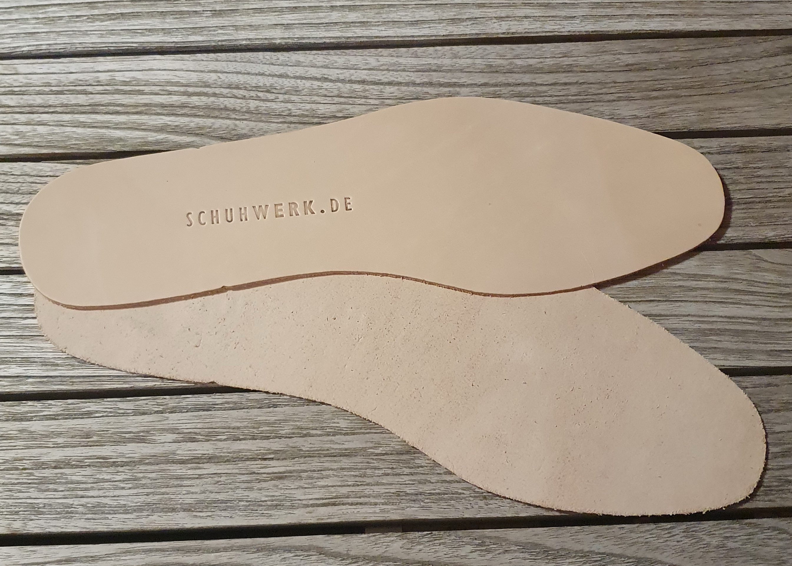 All die besonderen Eigenschaften, die pflanzlich gegerbtes Leder auszeichnet, kommen besonders auch bei den Einlegesohlen zum Tragen. Es ist sehr atmungsaktiv, etwa 1,4 mm dick, kann viel Feuchtigkeit aufnehmen und hält damit immer ein angenehmes Klima im Schuh.