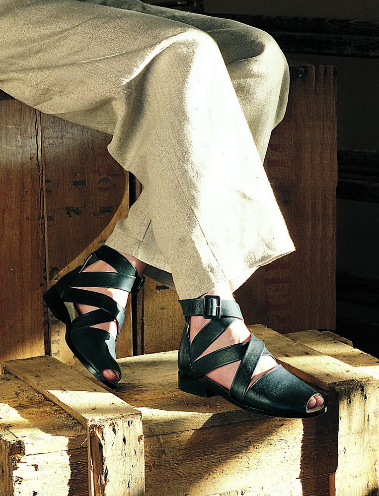 Aufwendig verarbeitete, knöchelhohe Bändersandale mit Schnalle, aus weichem Kalbnappaleder, mit Kalbleder gefüttert, einer leichten Ledersohle mit Gummiauflage und einem kleinen Holzabsatz und einem eingearbeitetem Korkfußbett.