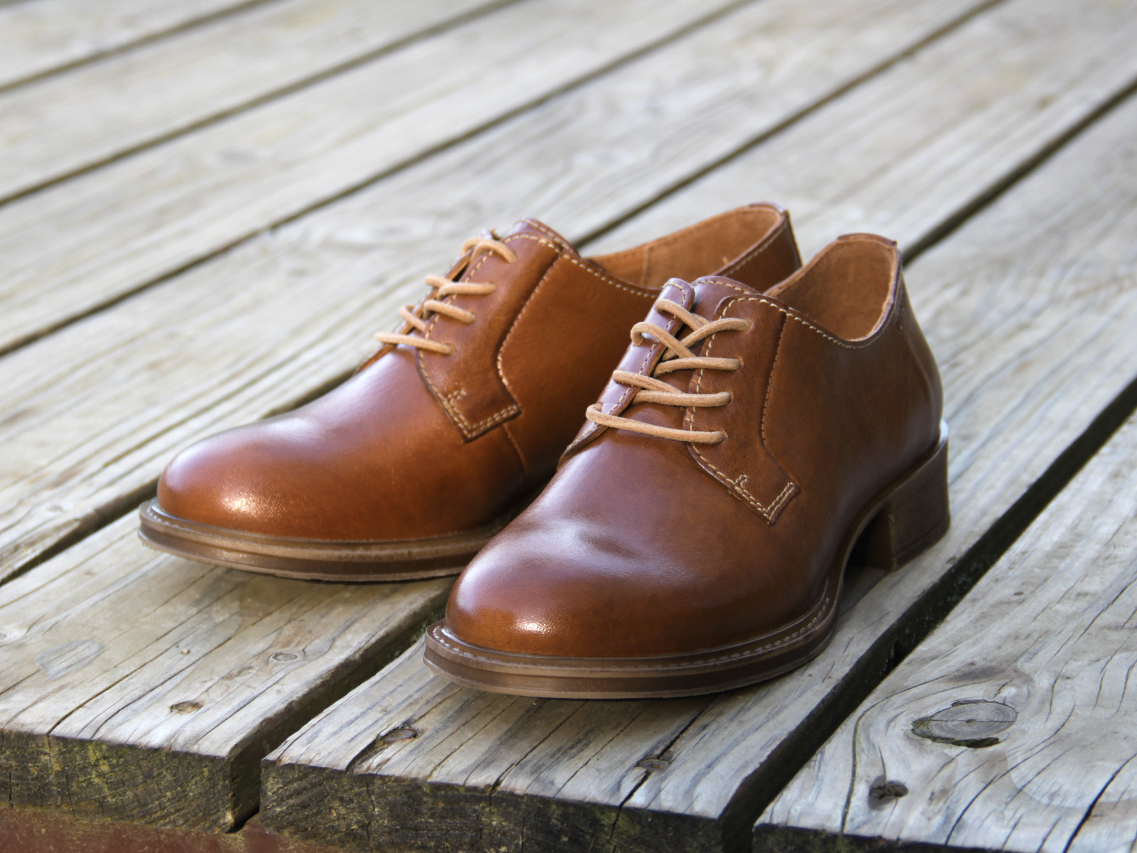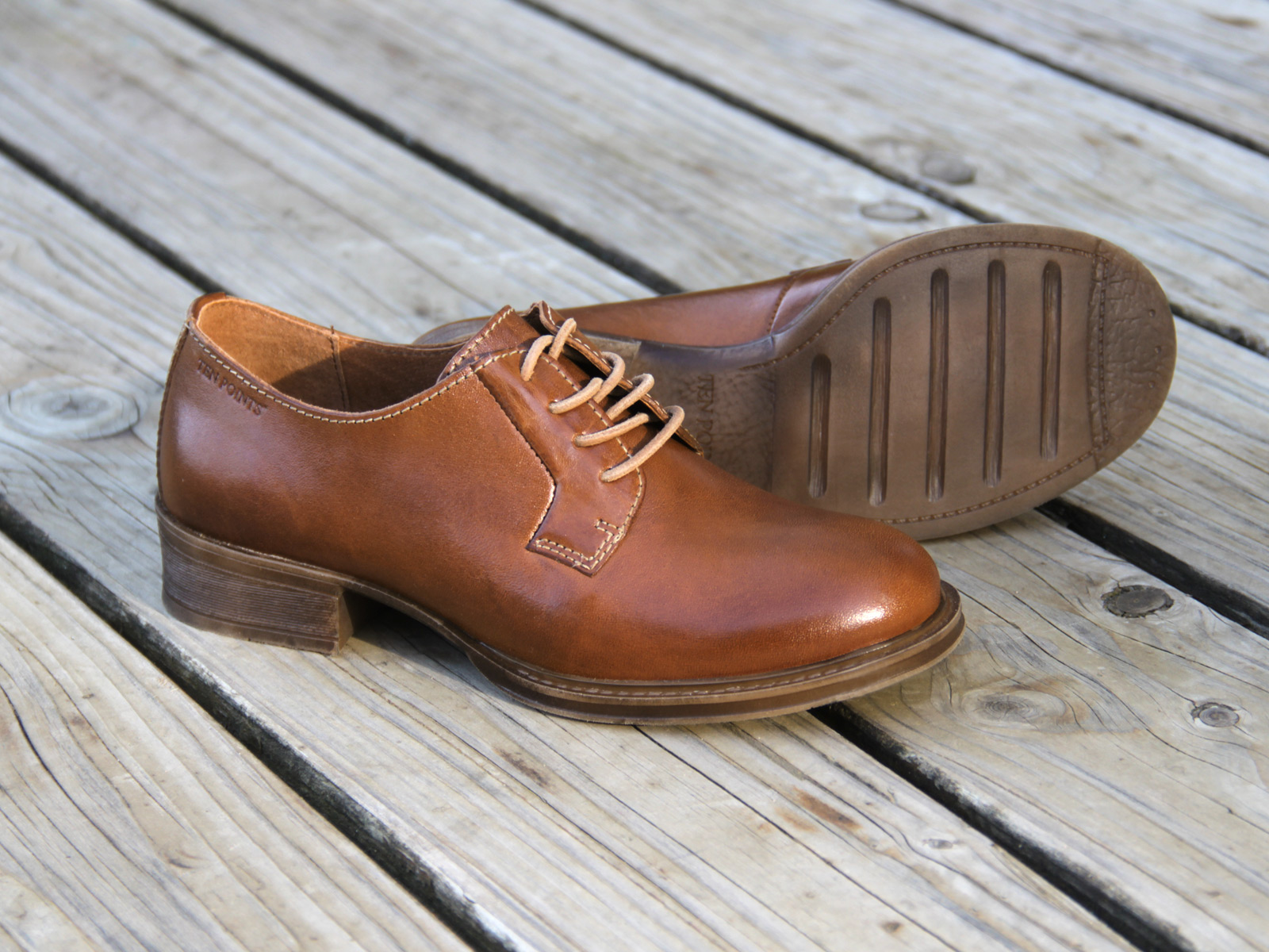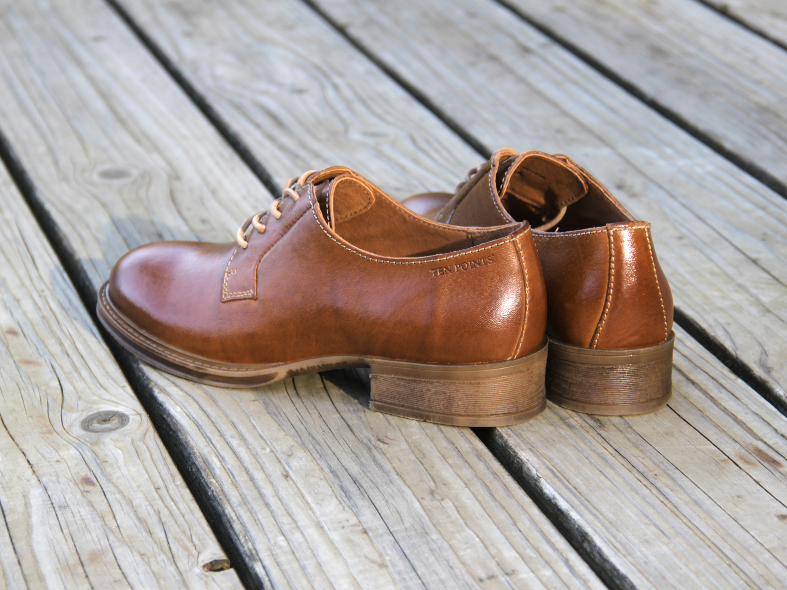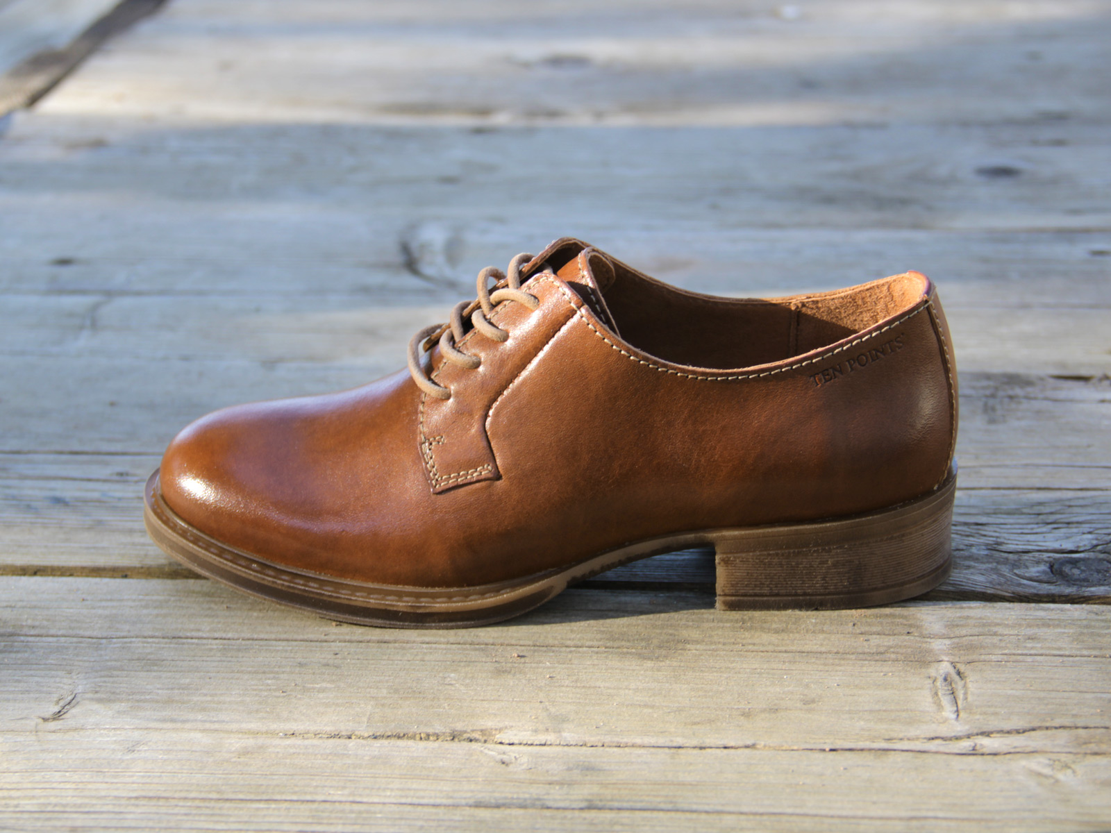 Nordisches Design, bewährter Schnitt, hochwertige Verarbeitung: STIENE aus dem Ökoprogramm des schwedischen Herstellers Ten Points verbindet Eleganz mit entspannter Unaufgeregtheit. Die klassische Schnürschuhform erhält durch das robuste Glattleder mit leichtem Glanz und die besondere Akzentuierung mit feinen Ziernähten eine elegante Note. Das pflanzlich gegerbte Rindleder in warmem Cognacton bekommt mit der Zeit eine schöne Patina. Für den besonderen Look von Struktur und Glanz wird es in verschiedenen Techniken gewachst und gebürstet. Die gepolsterte, mit weichem Futterleder bezogene Innensohle ist herausnehmbar. Die Laufsohle ist aus Gummi. Sohle und Schaft sind miteinander vernäht. Diese so genanten «Blake-Machart» kommt ohne Rahmennaht und Zwischensohle aus, was durchgenähte Schuhe leicht und gleichzeitig flexibel macht. Ten Points Schuhe werden in Schweden entworfen und nachhaltig und unter fairen Bedingungen in Portugal gefertigt. Das Label steht für hochwertige Schuhmacherkunst mit Tradition, verbindet Funktionalität mit viel Komfort und setzt auf langlebige Materialien.