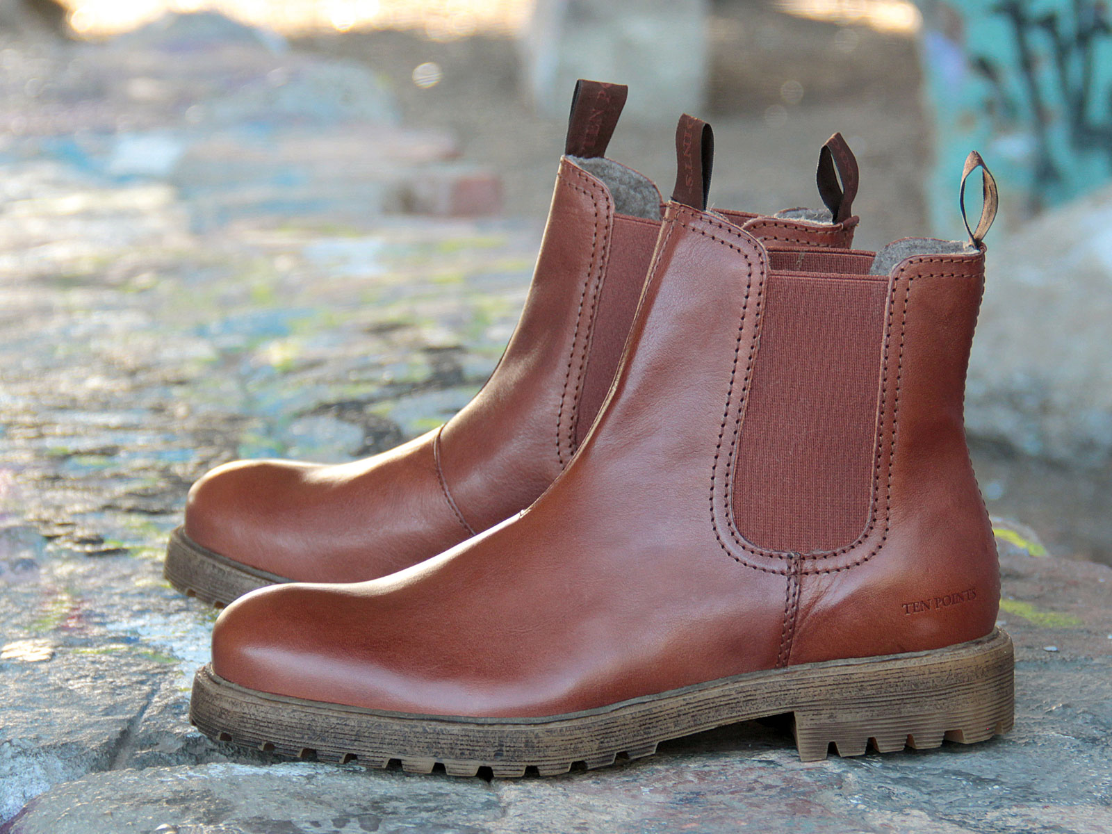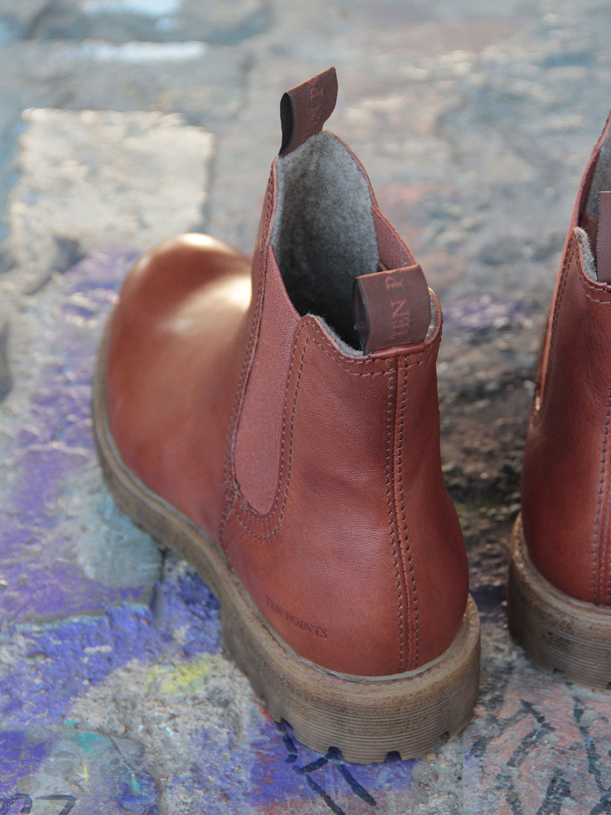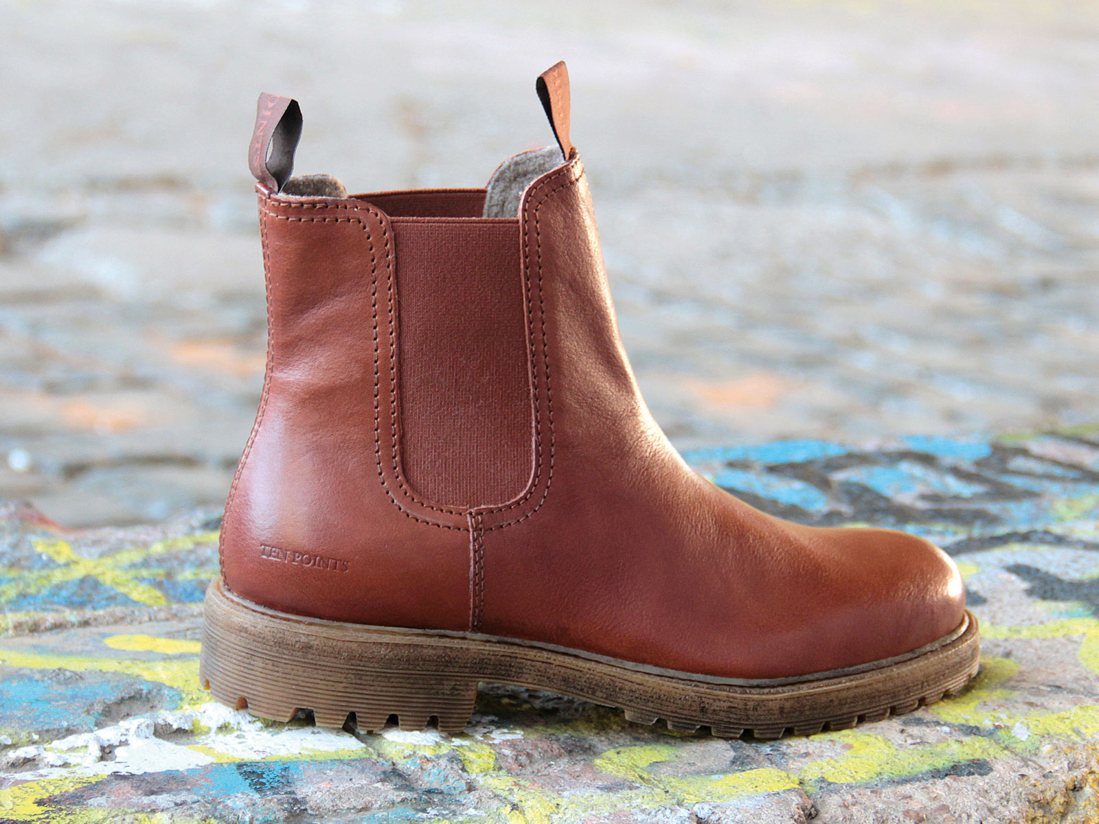 Herrenwinterschuhe mit hoher Qualiät aus Echtleder Bequemer Boot mit guter Passform und einem wärmenden Wollfutter. Die knöchelhohe Form mit zwei praktischen Anziehschlaufen ist klassisch geschnitten und lässt sich gut zu sportlichen Outfits kombinieren. Durch die Stretcheinsätze an beiden Seiten sitzt ESKIL perfekt am Fuß.Auch die Innensohle ist mit Wollfilz bezogen, ein Material das gut Feuchtigkeit aufnehmen kann und die Füße warm und trocken hält. Die Gummisohle dämpft den Auftritt, isoliert gegen kalte Böden und gibt mit einem kräftigen Profil guten Halt.Das pflanzlich gegerbte Glattleder, das für den besonderen Look von Struktur und Glanz in verschiedenen Techniken gewachst und gebürstet wird, ist hochwertig verarbeitet.Ten Points entwirft das Ökoschuhprogramm in Schweden und lässt die Schuhe nachhaltig und unter fairen Bedingungen in Portugal fertigen. Das Label steht für hochwertige Schuhmacherkunst mit Tradition, verbindet Funktionalität mit viel Komfort und setzt auf langlebige Materialien.