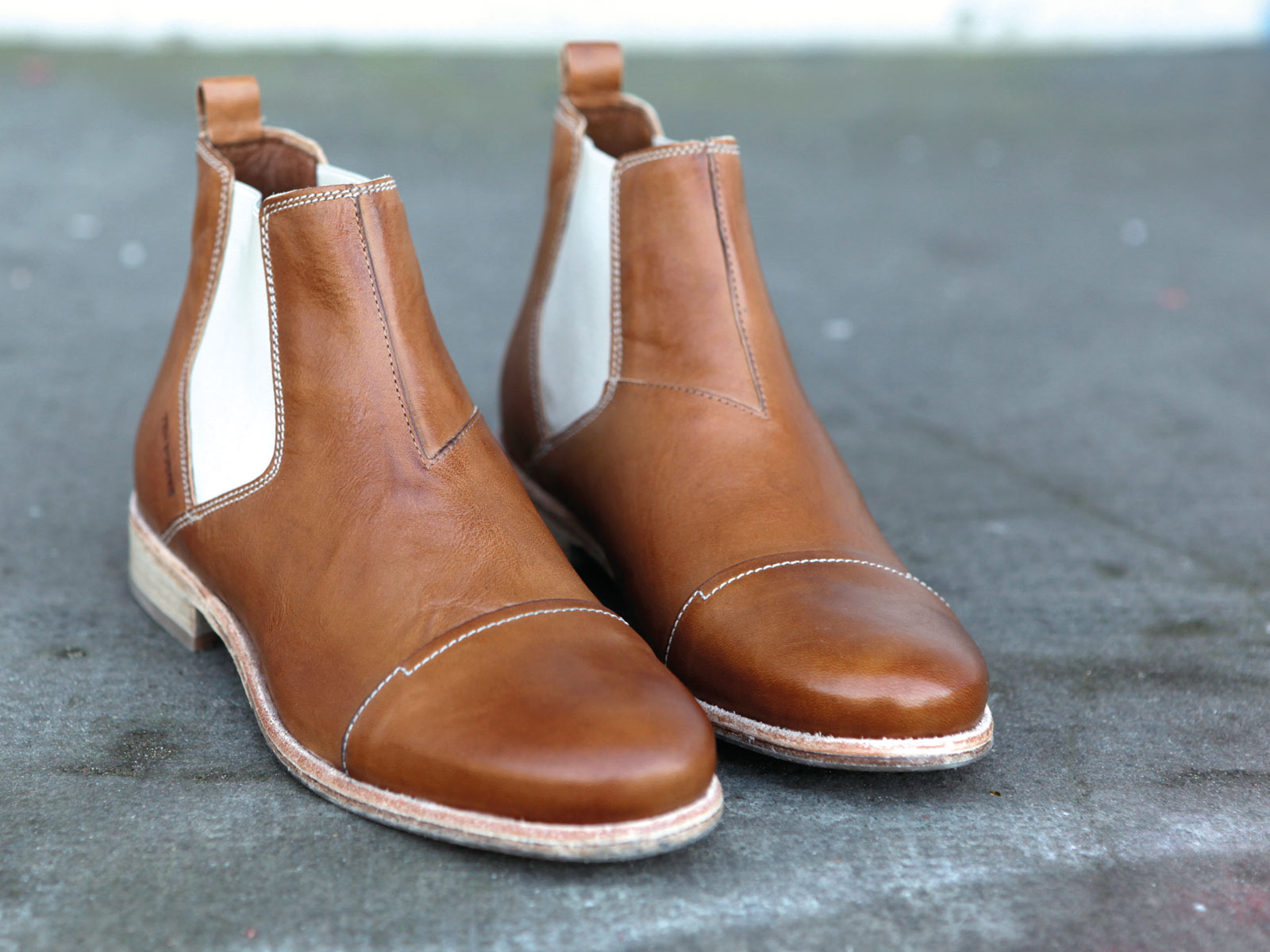 Die Verarbeitung ist hochwertig: die Ledersohle mit einer Auflage aus Gummi ist mit dem Schaft vernäht. Diese Machart, genannt «Blake», kommt ohne Rahmennaht und Zwischensohle aus, was durchgenähte Schuhe leicht und haltbar macht. Durch die Stretcheinsätze an beiden Seiten sitzt der Schuh bequem am Fuß. Ein weiches Innenfutter aus atmungsaktivem Leder sorgt auch an warmen Tagen für ein gutes Klima im Schuh. Die gepolsterte Innensohle ist herausnehmbar.
