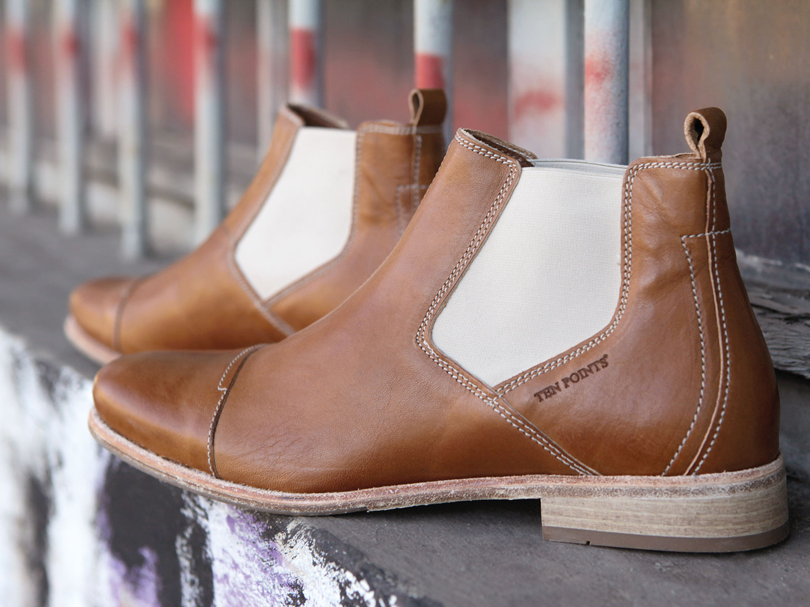 Naturgegerbte Chelsea-Stiefelette umweltfreundlich produziert Klare Linien, überzeugendes Design, hochwertiges Leder - ein perfekter Schuh für alle Tage. Die Chelsea-Stiefelette HEDDA aus dem Ökoprogramm von Ten Points beeindruckt durch den Kontrast von dunklem Leder mit feinen Kontrastnähten, hellen strukturierten Stretcheinsätzen und den warmen Brauntönen der Sohlen. Das weiche, pflanzlich gegerbte Leder ist sorgfältig verarbeitet und bekommt mit der Zeit eine schöne Patina. HEDDA hat eine rutschhemmende Gummi-Sohle mit einem etwa 3,5 cm hohen Absatz und ein weiches Innenfutter aus atmungsaktivem Leder, das für ein gutes Klima im Schuh sorgt. Ten Points Schuhe werden in Schweden entworfen und in Portugal fair und nachhaltig produziert. Das Label steht für hochwertige Schuhmacherkunst mit Tradition, verbindet Funktionalität mit viel Komfort und setzt auf langlebige Materialien.