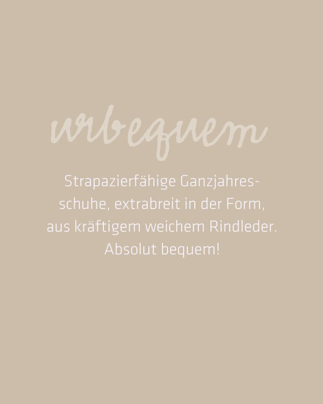 Genau so bequem wie Sie aussehen: ausserordentlich belastbare Ganzjahresschuhe aus kräftigem, pflanzlich gegerbtem Rindleder in warmen Farben. Die weite UR-bequeme Form lässt den Füßen viel Bewegungsfreiheit und die Gummiprofilsohle sorgt für sicheres Gehen und Stehen. Besonders angenehm ist das Polster aus weichem Nappaleder im Knöchelbereich und die herausnehmbare Einlegesohle aus Filz und Leder. RIQUO W kommt mit einer rutschfesten Wanderprofilsohle mit leichtem Absatz. Starkes Leder, starke Nähte. Handgefertigt in Deutschland, flexibel und solide mit einer Doppelnaht vernäht. Dadurch sind Reparaturen einfach und kostengünstig. So sollten nachhaltige Schuhe sein. Sie haben spezielle Anforderungen an die Weite des Schuhes oder an die Sohle? Senden Sie uns einfach eine Mail, wir werden unser Möglichstes tun.