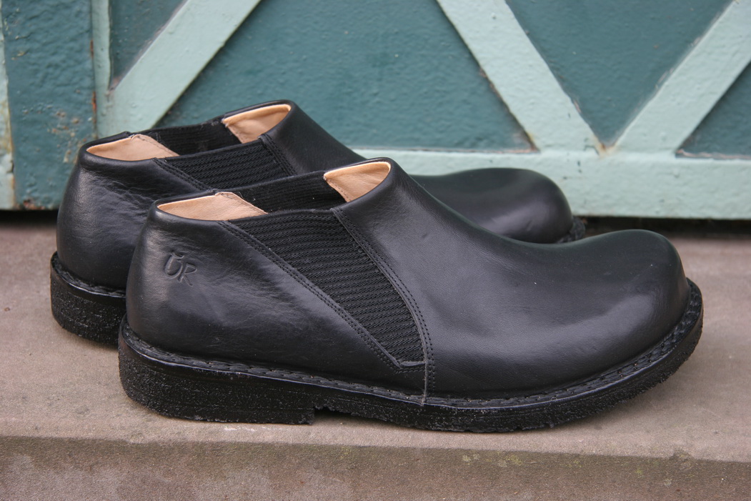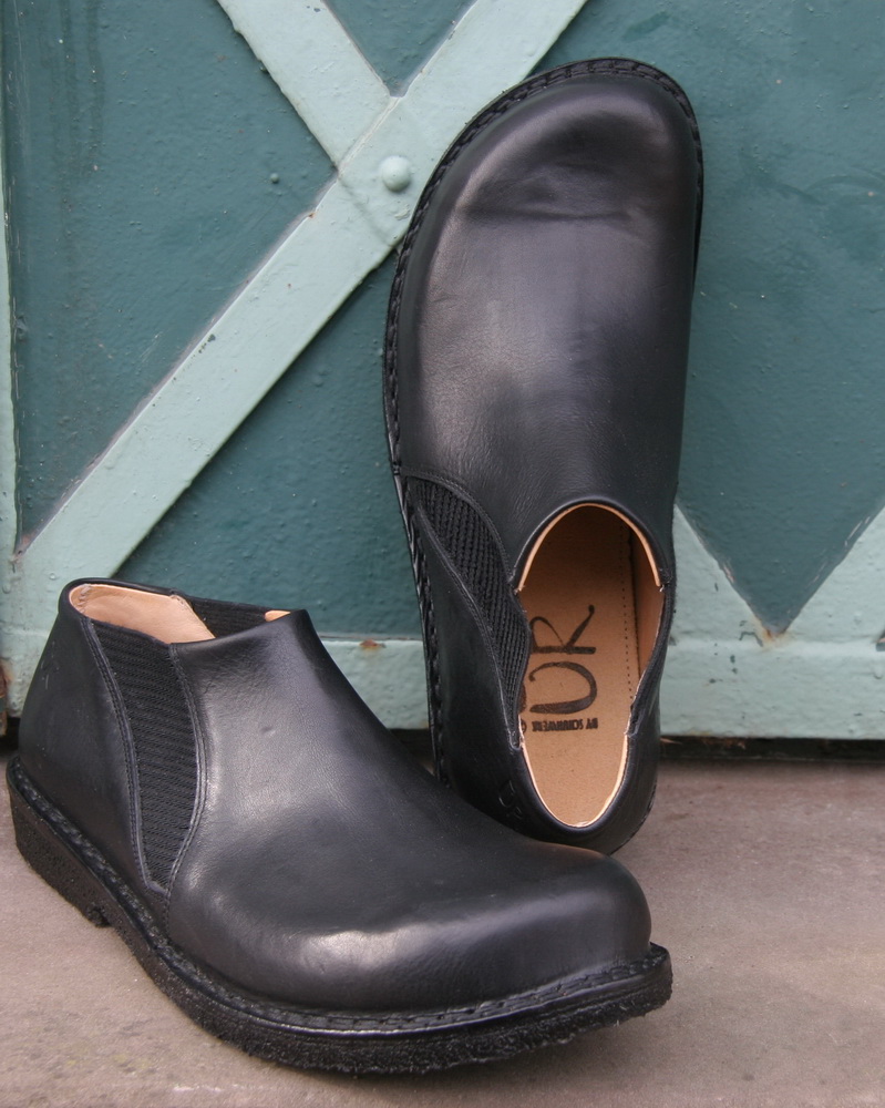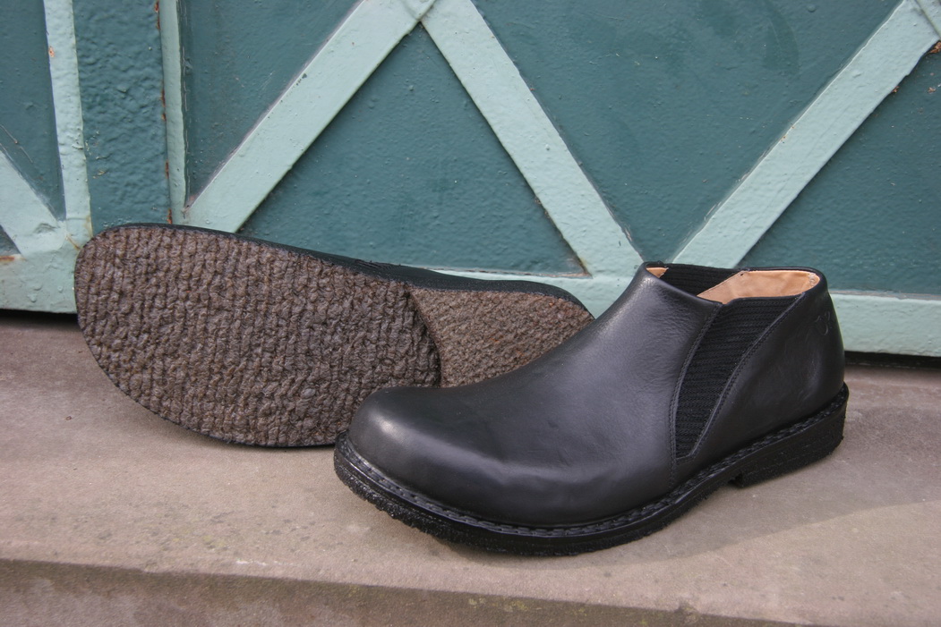 Formschöner Halbschuh aus vollnarbigem Rindleder, genäht und mit Lederfutter. Die weite, urbequeme Form läßt den Füßen durch einen seitlichen Strecheinsatz viel Bewegungsfreiheit und durch die weiche flexible Naturkreppsohle rollt der Fuß beim Gehen optimal ab. Die Einlegesohle aus Filz und Leder ist auswechselbar. Verkauf nur solange der Vorrat reicht.