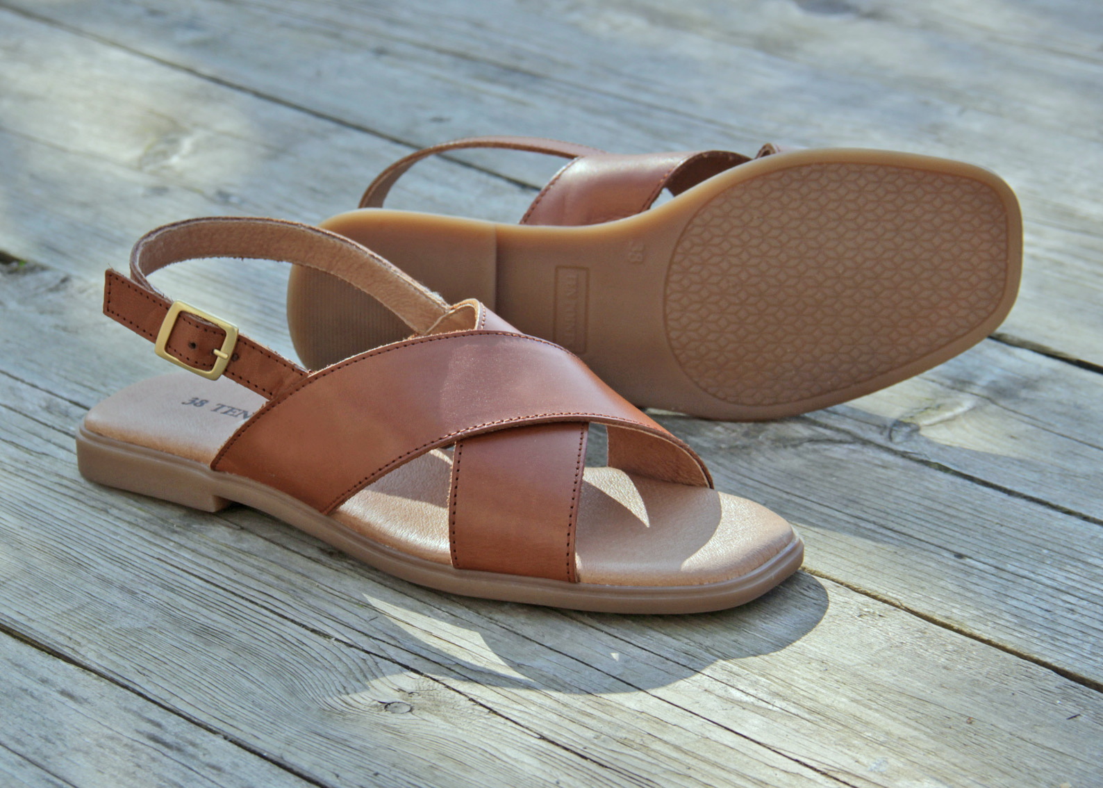 Offen, leicht, bequem – die nachhaltige flache Damensandale DANA, lässt den Füßen viel Freiheit und gibt dennoch guten Halt. Die schlichte Form lässt sich ebenso gut zu Jeans tragen wie zu verspielten Blumenkleidern. Das Design kommt aus Schweden, gefertigt werden die Schuhe in Portugal. Das weiche, fein strukturierte Rindleder ist pflanzlich gegerbt und frei von Chrom. Es wird gewachst und gebürstet, um einen besonders schönen Glanz zu bekommen. Die gepolsterte Innensohle ist im Zehenbereich mit Oberleder, im hinteren Bereich mit Futterleder bezogen, das auch an warmen Tagen für viel Komfort und ein gutes Trageklima sorgt. Die leichte Sohle ist rutschfest, der Absatz ist 8 mm hoch und hat eine trittsichere Auflage aus Gummi. DANA ist ein Modell aus dem Ökoprogramm des schwedischen Herstellers Ten Points, der Funktionalität mit viel Komfort verbindet und langlebige Materialien einsetzt. Die Sandalen werden in Schweden entworfen und in Portugal gefertigt.