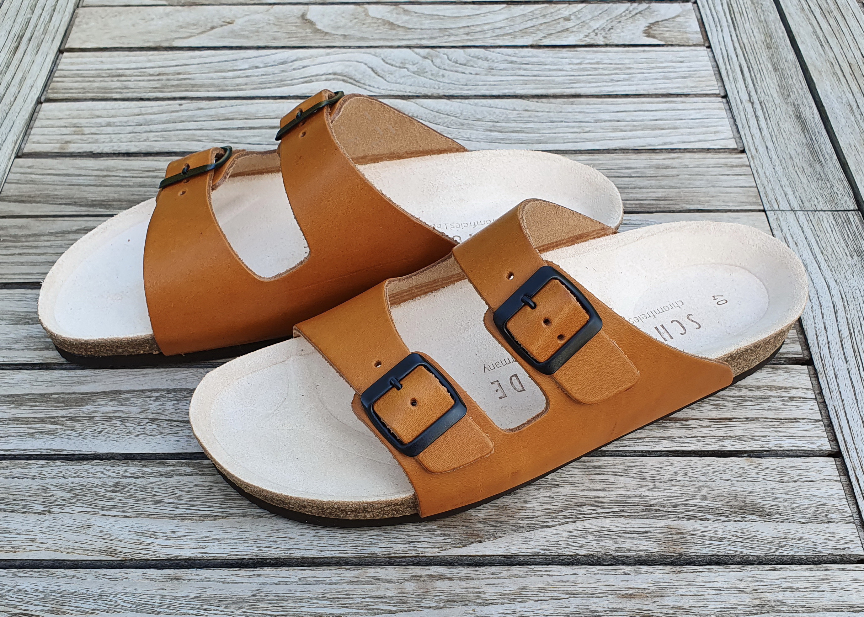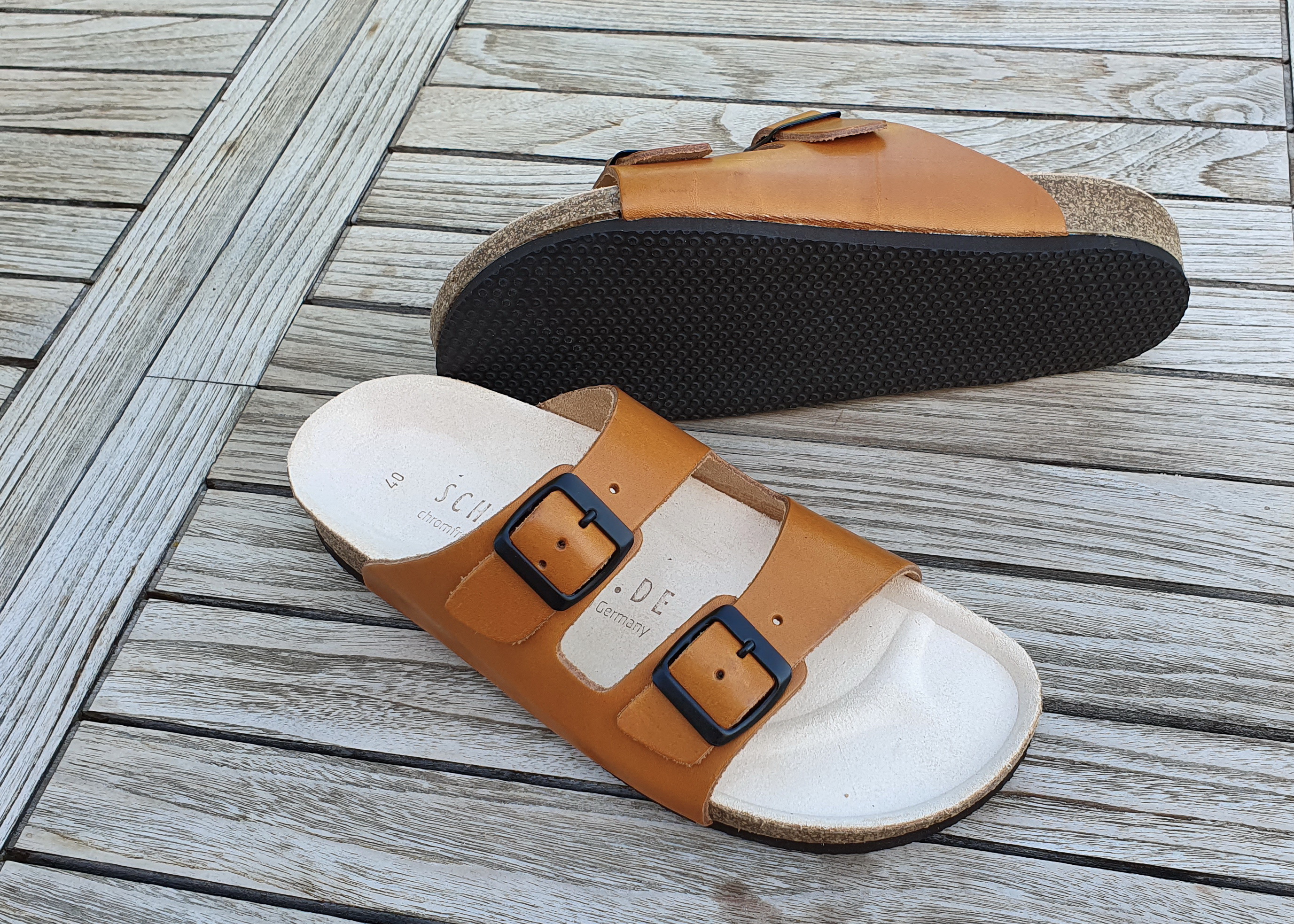Beliebte Sandale mit klassisch bequemer Form - chromfrei gegerbt - Bewährte, beliebte und lässige Sandale mit zwei verstellbaren Riemen für optimalen Tragekomfort. Die klassisch- bequeme Form lässt den Füßen besonders viel Freiheit. Mit leichter, abriebfester Kautschuksohle und einem lederbezogenen Fußbett aus Naturkork, welches das Längs- und Quergewölbe des Fußes unterstützt.Wir verwenden ausschließlich sehr hochwertiges, pflanzlich gegerbtes, chromfreies Leder. Damit der natürliche Charakter und die guten Eigenschaften des Leders erhalten bleiben, verzichten wir auf Farbbeschichtungen und Zurichtungen. So entstehen lange haltbare Sandalen, die auch bei empflindlicher Haut und Chromatallergien tragbar sind. Die Sandalen werden in Deutschland hergestellt.Das Material der Sohlen besteht aus 100% Gummi und wird in Italien aus Naturkautschuk hergestellt. Die Vorteile im Vergleich zu sonst üblichen EVA-Sohlen sind: - das Material besteht aus nachwachsendem Naturkautschuk, der aus Latexmilch gewonnen wird und biologisch abbaubar ist.- Gummi ist deutlich rutschfester- hat sehr gute trittdämpfende Eigenschaften- gute Abriebfestigkeit Wenn die Sohle nach einiger Zeit abgenutzt ist, ist dies kein Grund die Schuhe wegzuwerfen: SCHUHWERK-Schuhe können problemlos und kostengünstig wiederbesohlt werden.