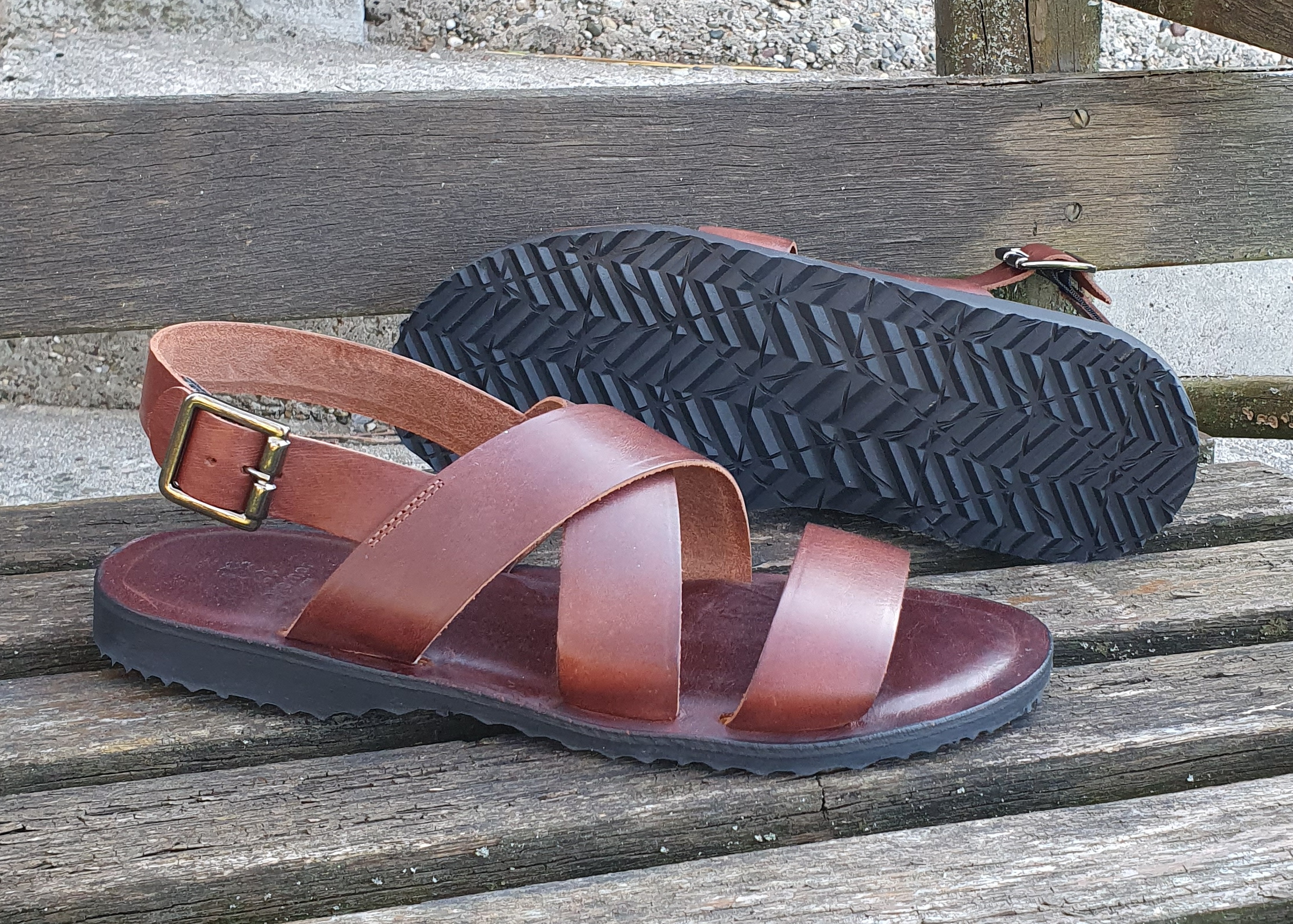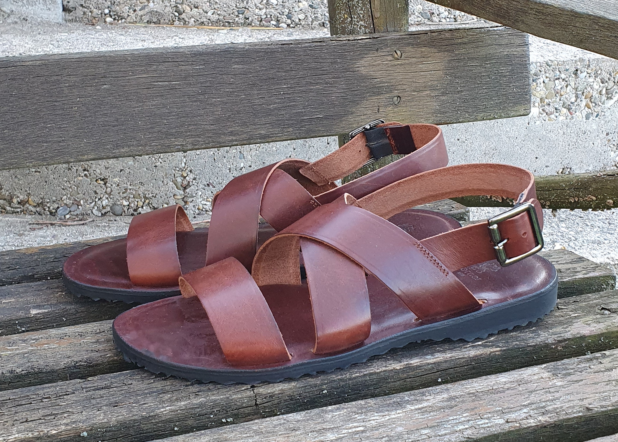 eine leichte und luftige Sandale, die durch zwei breite überkreuzte Lederbänder und einen verstellbaren, um die Ferse
