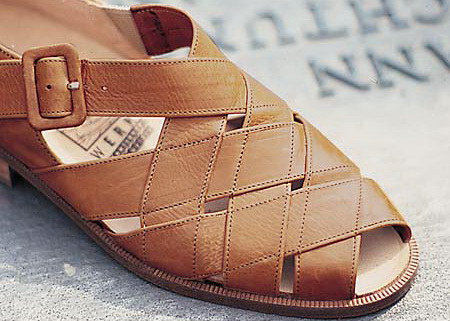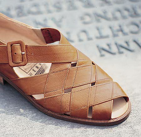 Sehr schöner Sommerschuh in klassisch geschwungener Form -besonderer Blickfang sind die gekreuzten Bänder an den offenen Seiten. Er ist aus weichem Kalbnappaleder, innen mit Kalbleder gefüttert und einer leichten Ledersohle verarbeitet. Ein fest eingearbeitetes Korkfußbett sorgen für natürliches Gehen.