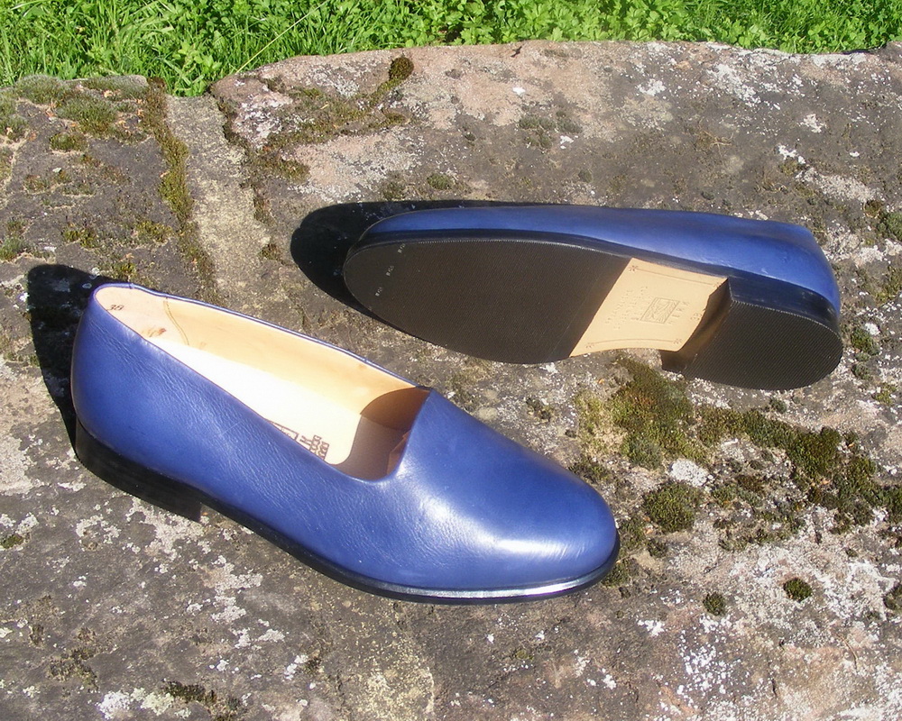Einfacher, eleganter Schuh in Ballerinaform, bei dem der schön geschwungene Abschluß ein besonderer Blickfang ist. Aus kräftigen Nappaleder gefertigt, das erstmal eingelaufen werden muss. Mit eleganter aber fester Ledersohle mit Gummiauflage und einem eingearbeitetem Korkfußbett das für locker-entspanntes Stehen und Gehen sorgt.