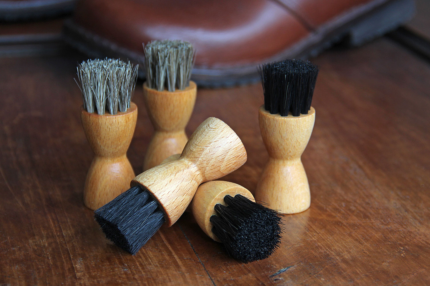 Kleine handliche Bürstchen zum Auftragen und Einmassieren der Schuhpflegemittel. Der Griff der Bürsten ist aus geöltem Buchenholz in schöner und ergonomisch geschwungener Form, die weichen Borsten aus hellem oder dunklem Rosshaar. Die Bürsten werden aus heimischen Hölzern und Haaren hergestellt von der deutschen Bürsten-manufaktur Redecker. Länge 5 cm, Durchmesser 2,2 cm