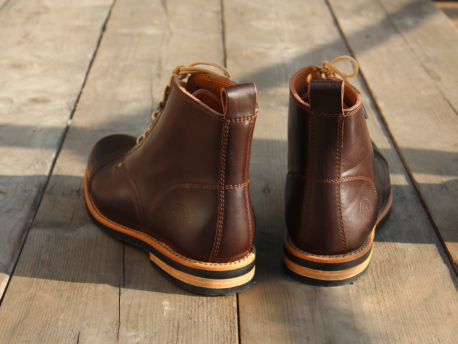 Die Boots werden im Goodyear Welt Verfahren hergestellt. Durch diese rahmengenähte Machart sind die Schuhe sehr langlebig und können einfach repariert werden. Für extra lange Lebensdauer werden die Sohlen heute wie damals aus recycelten und wiederverwerteten Reifen, gefertigt. Der genagelte Absatz besteht aus Vollleder und Gummi.
