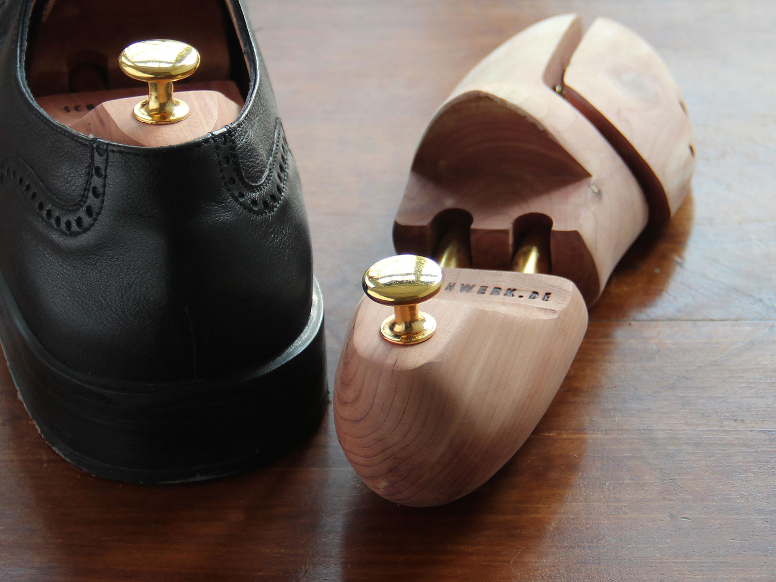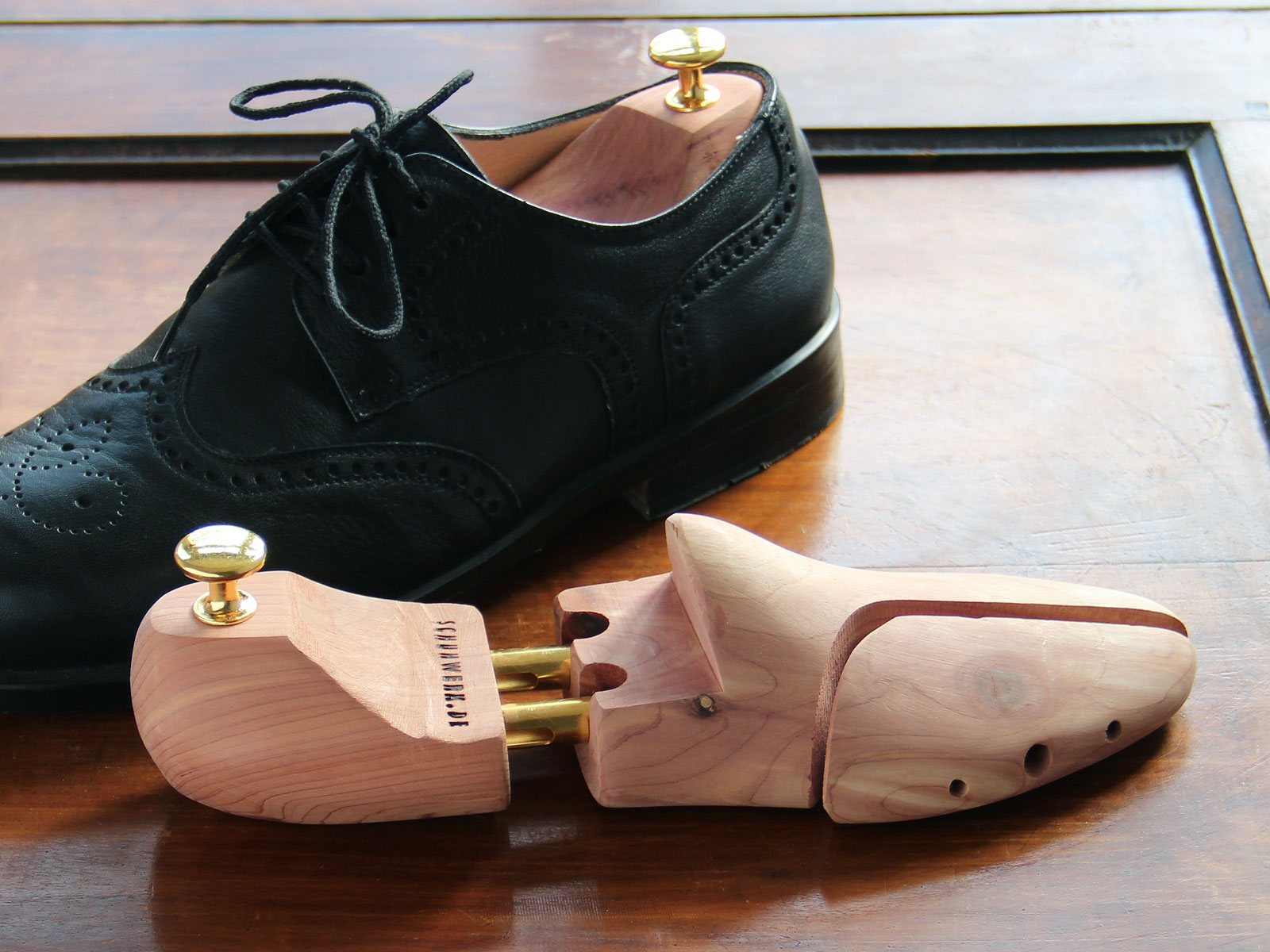 Während wir Schuhe tragen, geben unsere Füße Feuchtigkeit an das Leder des Schuhs ab. Weil sich das Leder dabei mit der Zeit verformt, ist es gut, den Schuh mit einem Schuhspanner in Form zu halten. Mit diesen hochwertigen Schuhspannern aus dem unbehandelten Holz der Rot-Zeder tut man das Maximum für seine Schuhe. Der Innenraum des Schuhes wird fast vollständig vom Leisten ausgefüllt. Das weiche Zedernholz mit schöner Maserung und aromatischem Duft entzieht dem Schuh auf natürliche Weise Feuchtigkeit. Das darin enthaltene ätherische Thujaplizin-Öl wirkt zudem antibakteriell.