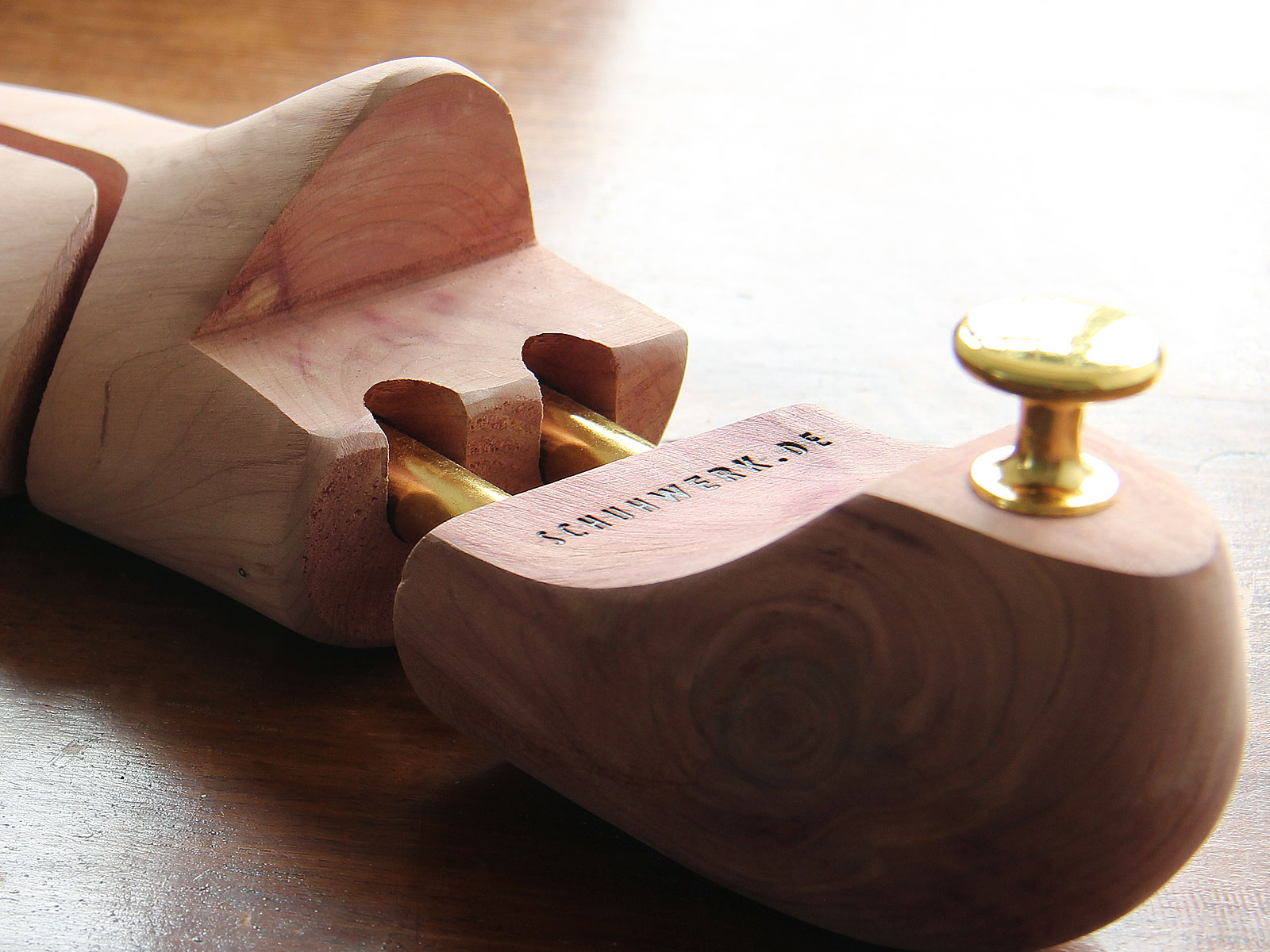 Die Zedernholz-Schuhspanner bestehen aus drei Teilen. Der vordere Teil passt sich durch eine eingearbeitete Federung der Breite des Schuhs an. Das Zwischenstück ist mit einer Doppelfederung versehen, die für eine optimale Anpassung an die Länge des Schuhs sorgt. Das anatomisch gerundete Fersenstück wird mit sanftem Druck in den Schuh eingeschoben und hält so auch die Hinterkappe in Form.