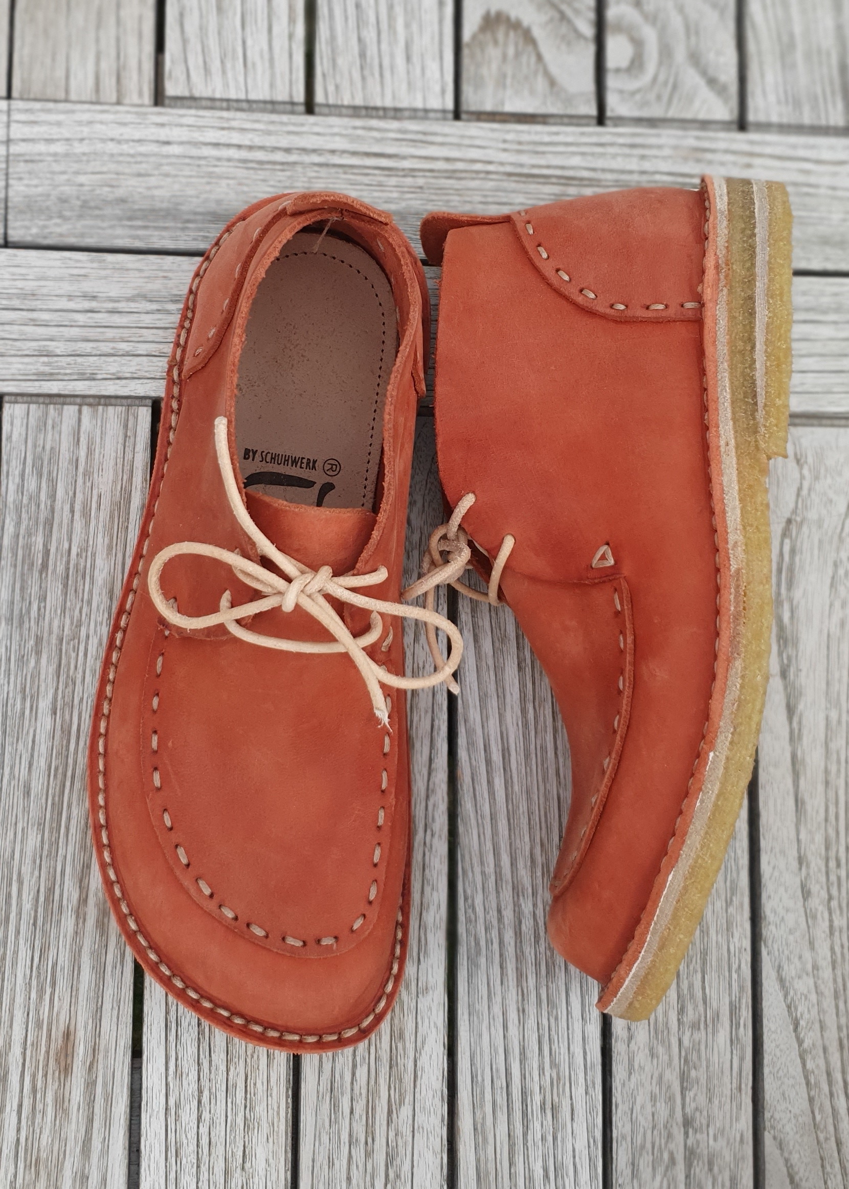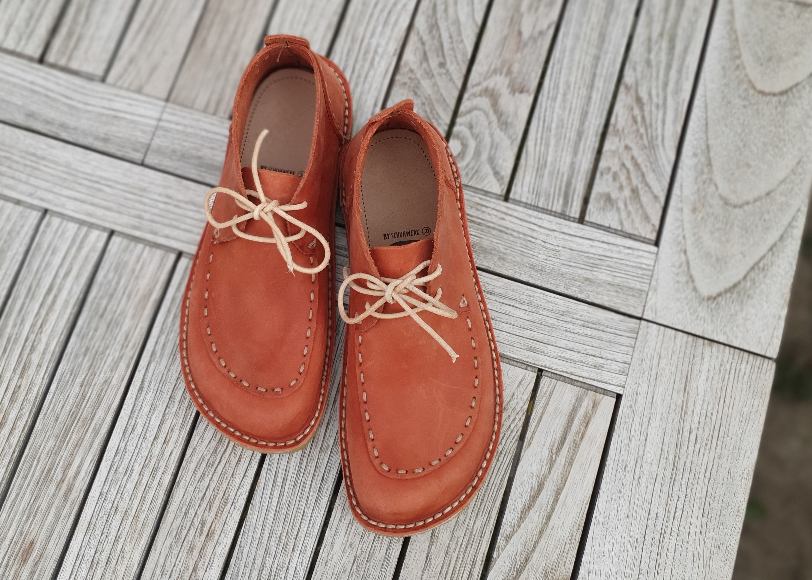 Superbequemer, strapazierfähiger Ganzjahresschuh zum Schnüren. Breit in der Form, aus kräftigem, weichem Rindleder und richtig bequem! Durch die pflanzliche Gerbung des Leders sind die Schuhe barfuß tragbar. Durch die weiche Naturkreppsohle mit leichtem Absatz geht man damit ganz natürlich und durch die genähte Machart sind die Schuhe haltbar und flexibel. Die Schuhe sind von Hand genäht, komplett in Deutschland gefertigt und wiederbesohlbar. Ein nachhaltiger Schuh, an dem Sie lange Freude haben.