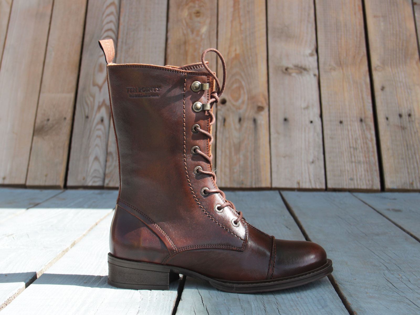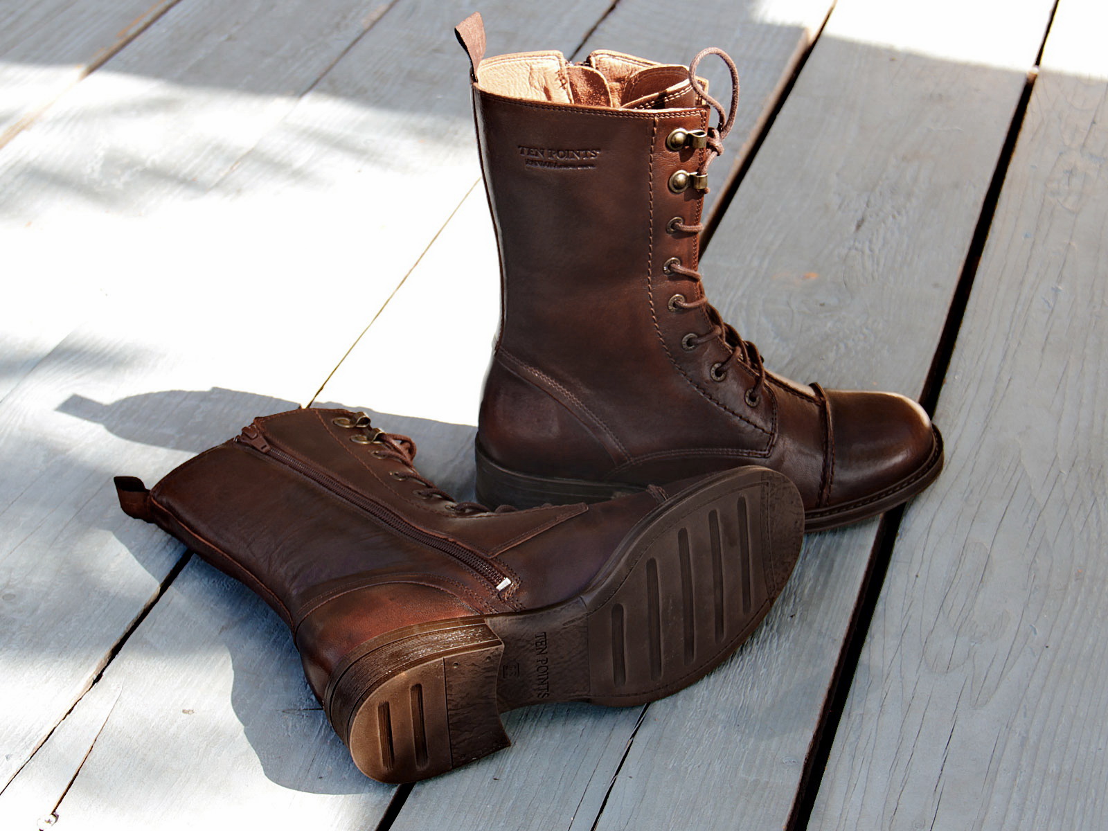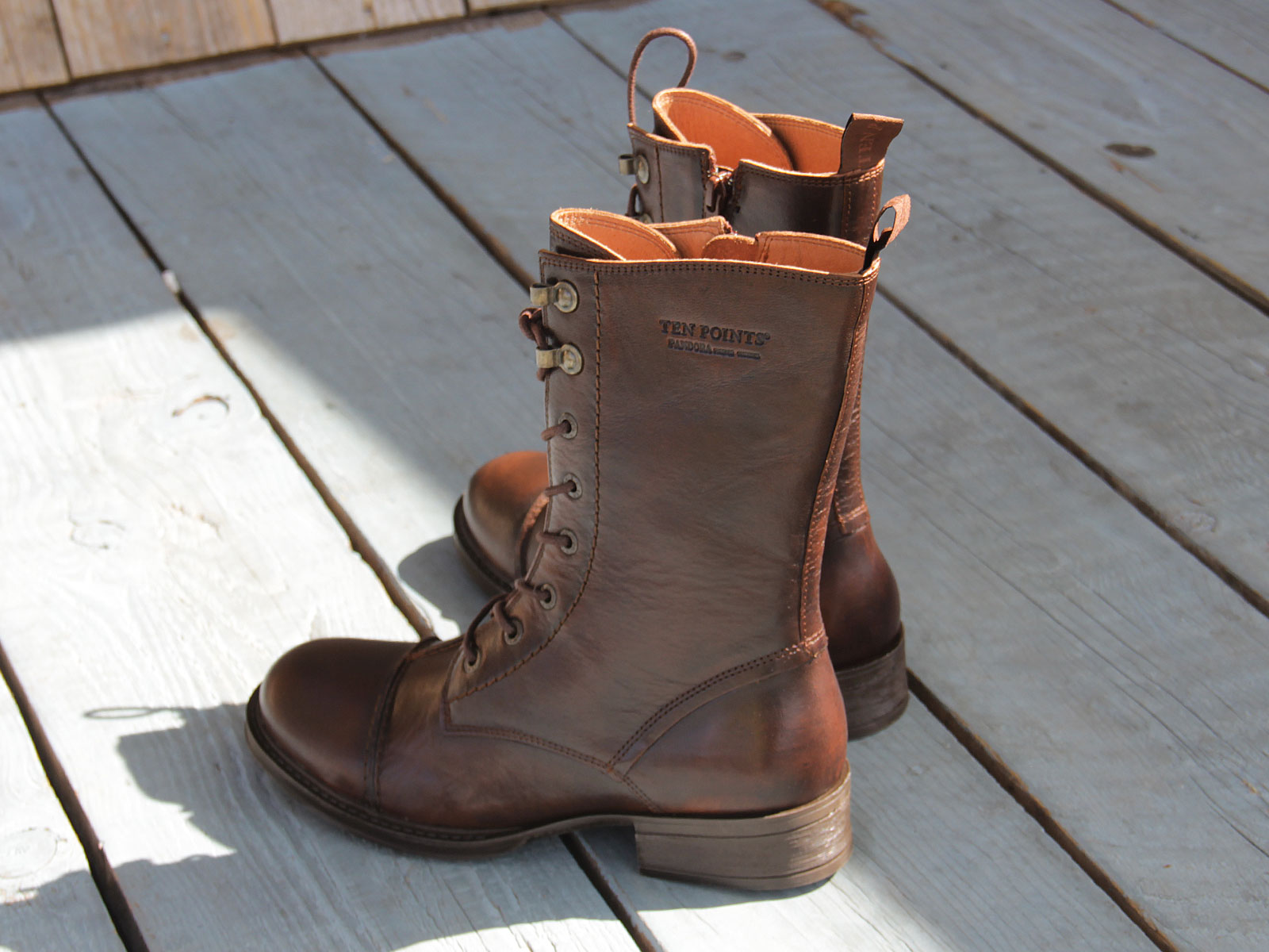 Hoher Stiefel mit robuster Plateusohle frei von Chrom Formschöner Stiefel aus dem Ökoprogramm von Ten Points mit robuster Plateau-Sohle, prägnanten Nähten und hoher Schnürung. Durch den Reißverschluss an der Innenseite und die praktischen Anziehschlaufen lassen sich die Stiefel bequem an- und ausziehen. Das Oberleder ist ein fein strukturiertes Rindleder – pflanzlich gegerbt und frei von Chrom. Um einen besonderen Glanz zu bekommen, wird es gewachst und gebürstet. Innen sorgt ein atmungsaktives Futterleder für Wohlfühlklima im Schuh und eine gepolsterte, herausnehmbare Innensohle für viel Komfort. Die Sohle ist aus thermoplastischem Kautschuk – rutschfest, mit geringem Abrieb und guten Tritteigenschaften. Nachhaltig, langlebig, durchdacht: Die Stiefel werden in Schweden entworfen und unter fairen Bedingungen in Portugal gefertigt.Dieses Modell gibt es auch in einem schönen Braunton mit