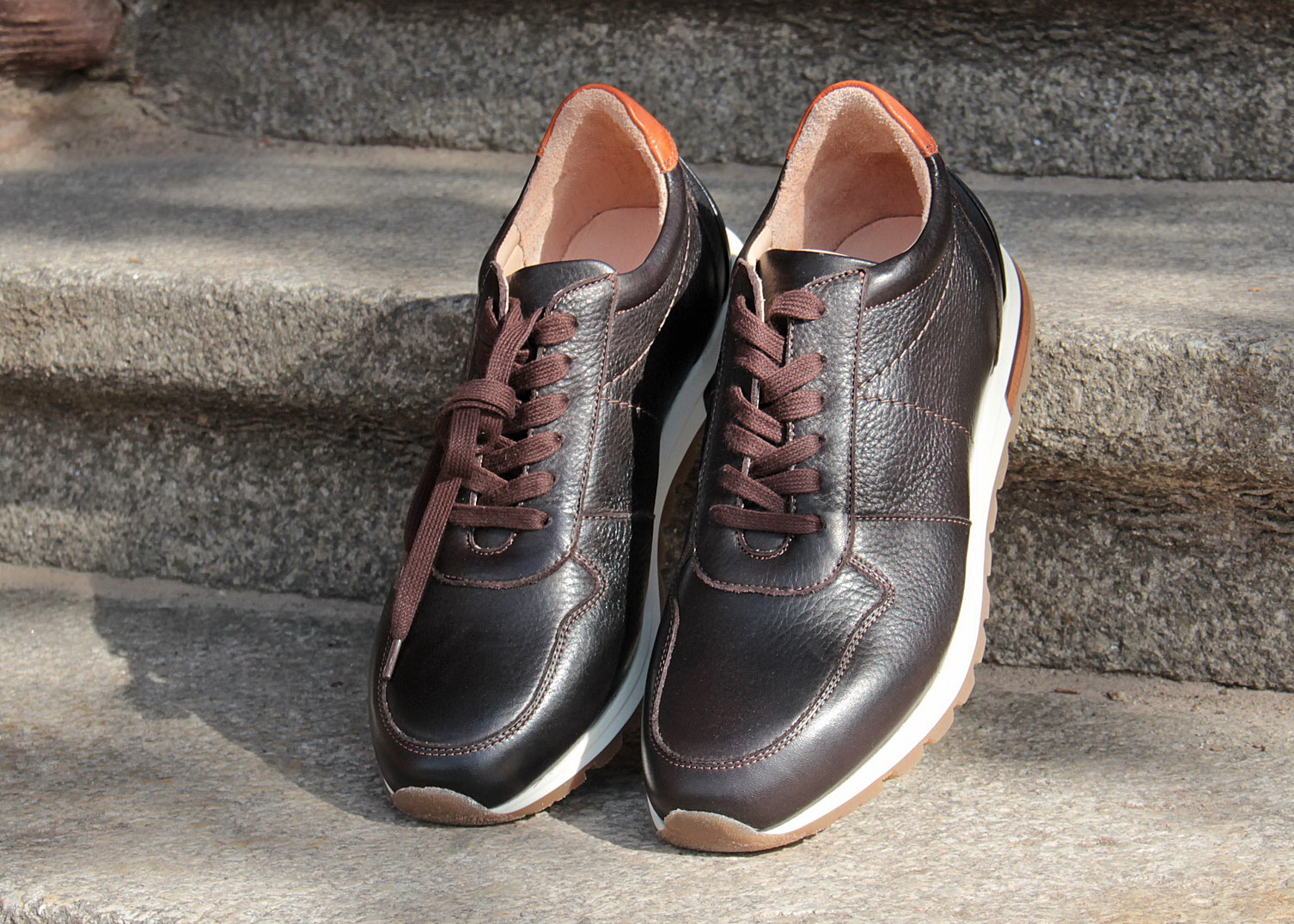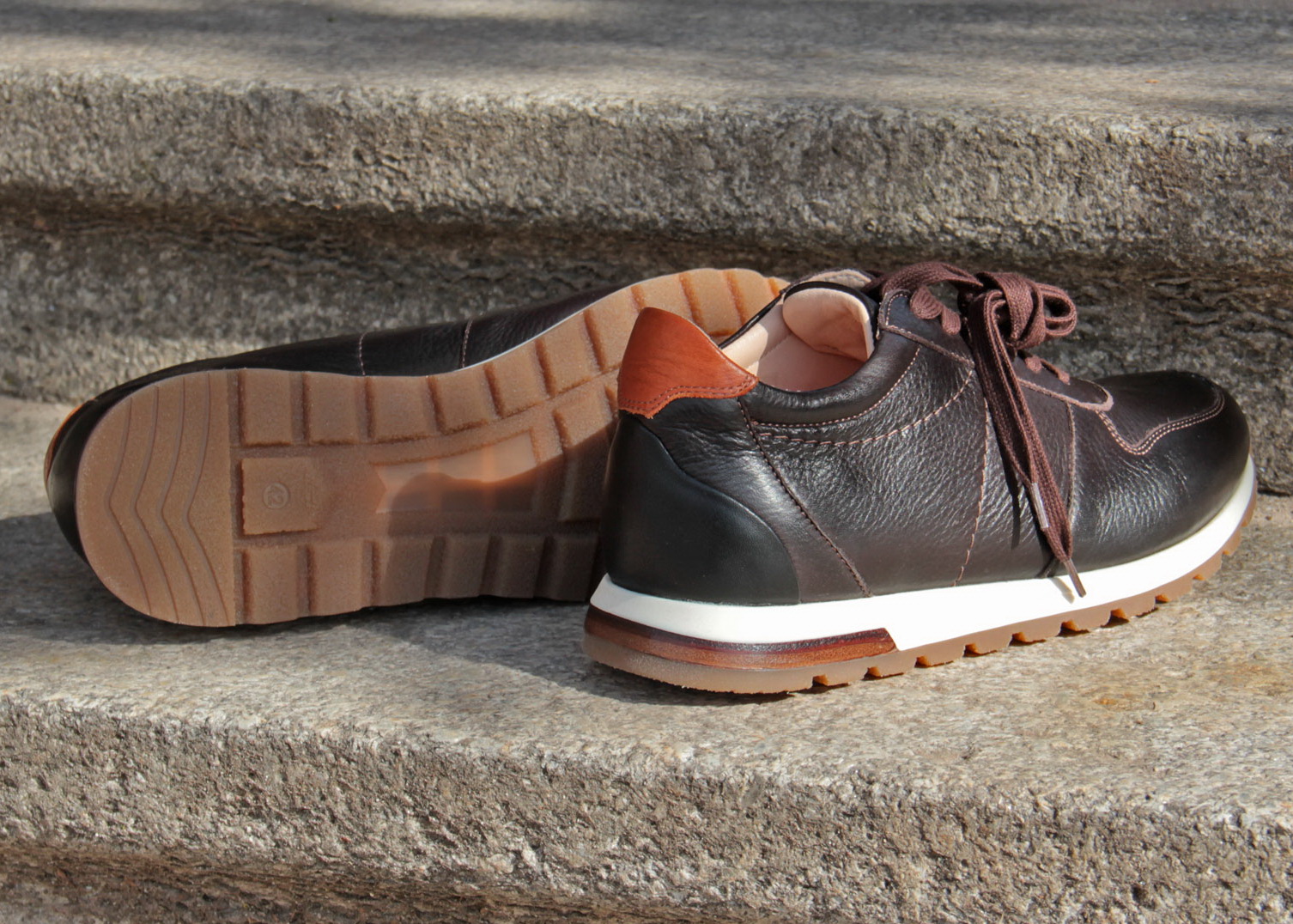 Markante Form, sportliche Optik, griffige Laufsohle – der Sneaker verbindet gekonnt die Anmutung eines Lederhalbschuhs mit dem Komfort eines Laufschuhs. Egal, ob Sie die Schuhe zum Business-Casual-Look mit Jeans oder einer Anzughose tragen, das schlichte Design wirkt elegant und professionell. Die stilvoll dunkelbraune Farbe lässt sich vielseitig kombinieren.