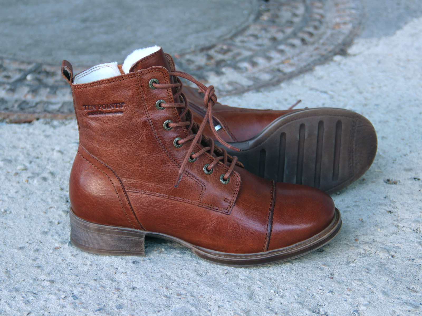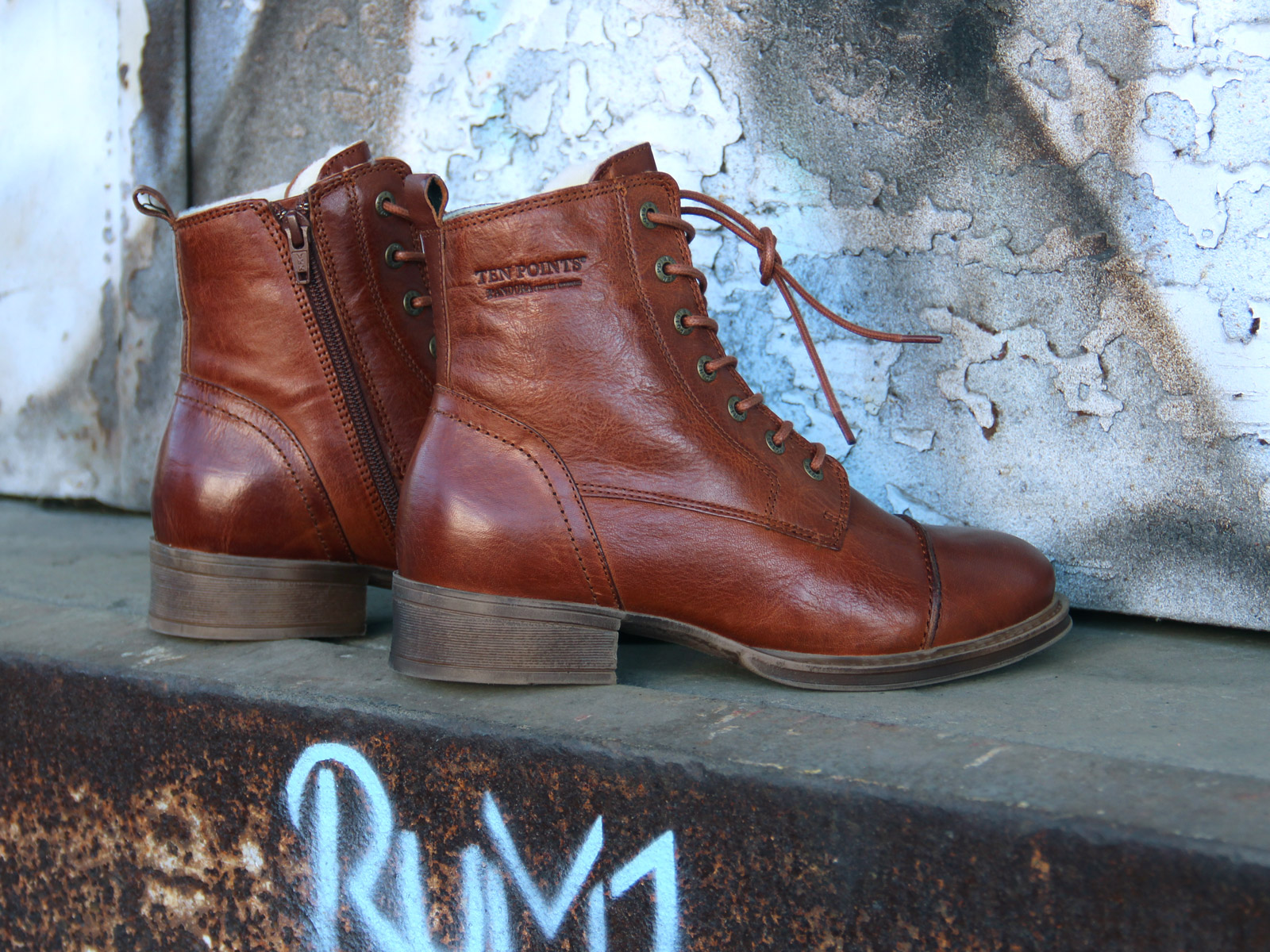 Chromfreie und ökologische Damenstiefelette Bequeme Schnür-Stiefelette mit guter Passform aus dem Ökosortiment von Ten Points. Auch mit dem aktuellen Herbstprogramm gelingt dem Label wieder sehr entspannt die Verbindung von eleganter Anmutung und nordischer Lässigkeit.Das Oberleder ist ein pflanzlich gegerbtes Glattleder, das für den besonderen Look von Struktur und Glanz in verschiedenen Techniken gewachst und gebürstet wird. Der Schaftrand ist gepolstert, innen sorgt ein atmungsaktives Futterleder für Wohlfühlklima im Schuh. Mit Reißverschluß für ein einfaches An- und Ausziehen. Die Innensohle ist herausnehmbar. Die elastische Laufsohle aus Gummi dämpft den Auftritt und gibt mit einem leichten Profil guten Halt.Ten Points-Schuhe werden in Schweden entworfen und nachhaltig und unter fairen Bedingungen in Portugal gefertigt.