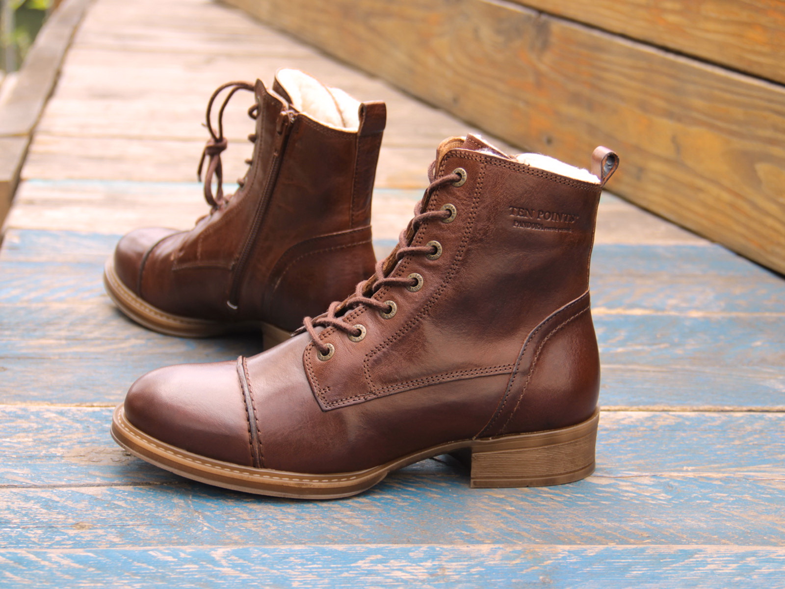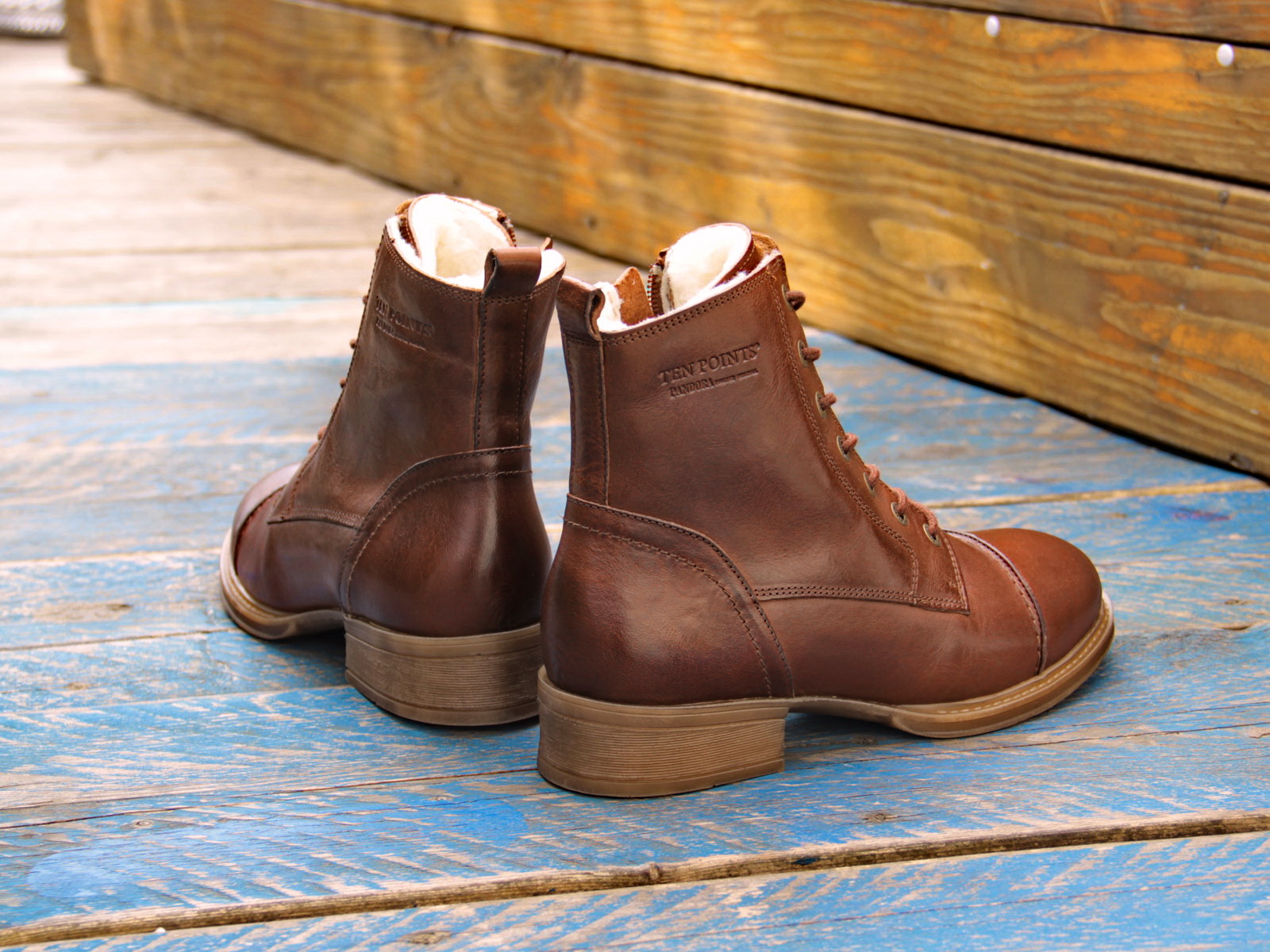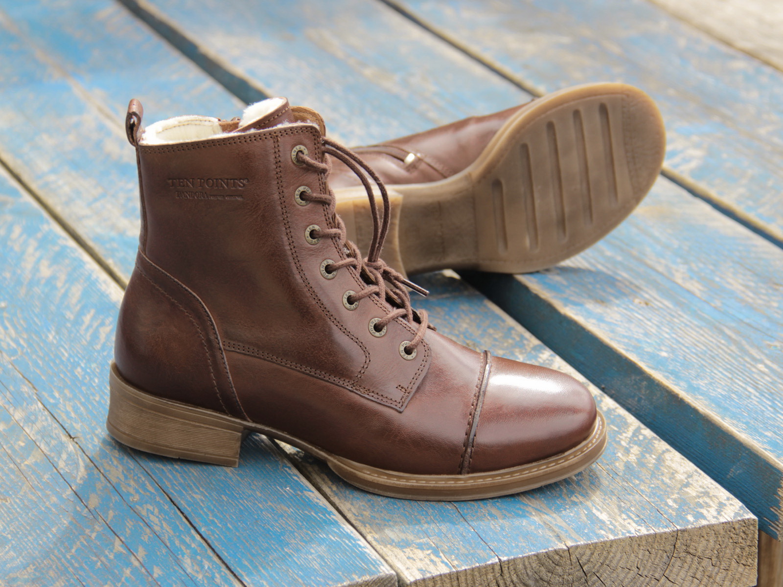 Chromfreie und ökologische Damenstiefelette Bequeme Schnür-Stiefelette mit guter Passform aus dem Ökosortiment von Ten Points. Auch mit dem aktuellen Herbstprogramm gelingt dem Label wieder sehr entspannt die Verbindung von eleganter Anmutung und nordischer Lässigkeit.Das Oberleder ist ein pflanzlich gegerbtes Glattleder, das für den besonderen Look von Struktur und Glanz in verschiedenen Techniken gewachst und gebürstet wird. Der Schaftrand ist gepolstert, innen sorgt ein atmungsaktives Futterleder für Wohlfühlklima im Schuh. Mit Reißverschluß für ein einfaches An- und Ausziehen. Die Innensohle ist herausnehmbar. Die elastische Laufsohle aus Gummi dämpft den Auftritt und gibt mit einem leichten Profil guten Halt.Ten Points-Schuhe werden in Schweden entworfen und nachhaltig und unter fairen Bedingungen in Portugal gefertigt.