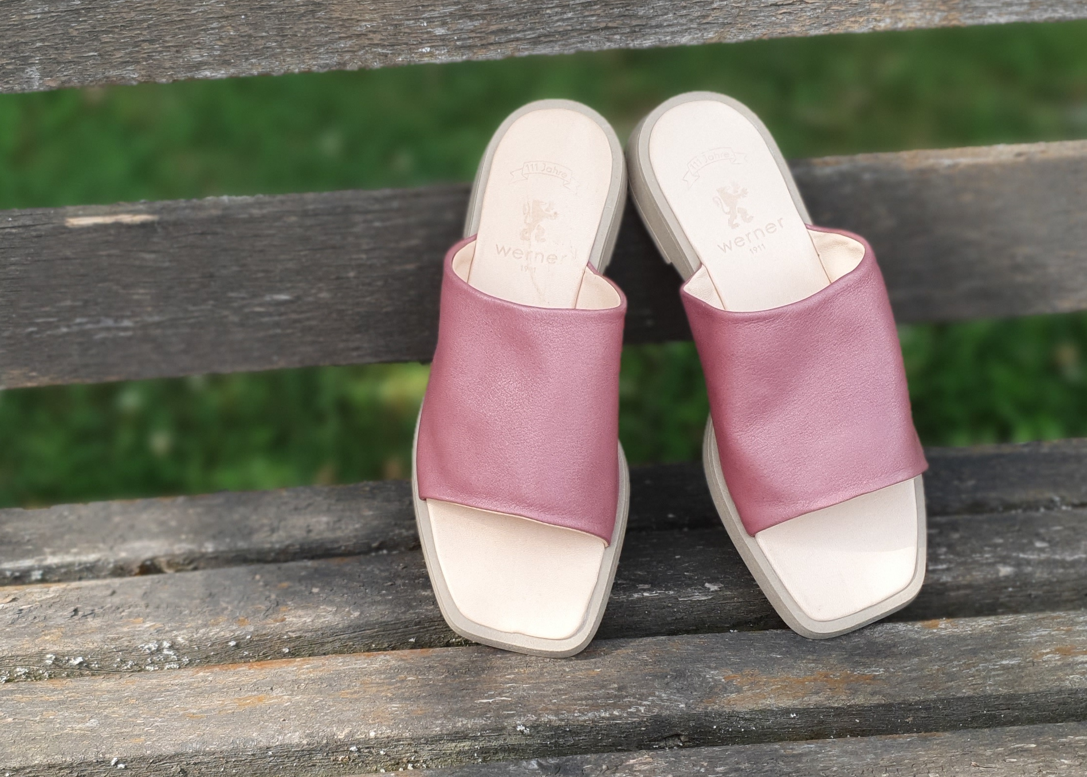 Leicht und unbeschwert – das könnten Ihre neuen Lieblingspantoletten werden! Breite gekreuzte Riemen aus geschmeidigem Rindnappaleder und eine trendige Plateau-Sohle mit leichtem Sägezahnprofil machen sie zu einem echten Hingucker. Für einen besonders guten Tragekomfort sorgen das zarte Lederfutter, das weich gepolsterte Fußbett und die sehr leichte, rutschhemmende und stoßdämpfende Sohle. Der Hersteller Werner Schuhe steht für zeitgemäßes Design und hochwertige handwerkliche Fertigung in Europa – fair, nachhaltig und umweltschonend. Die Ober-und Futterleder werden chromfrei und pflanzlich in Deutschland gegerbt. Durch den Verzicht auf eine chemische Oberflächenbehandlung behält das Leder seinen natürlichen Charakter.