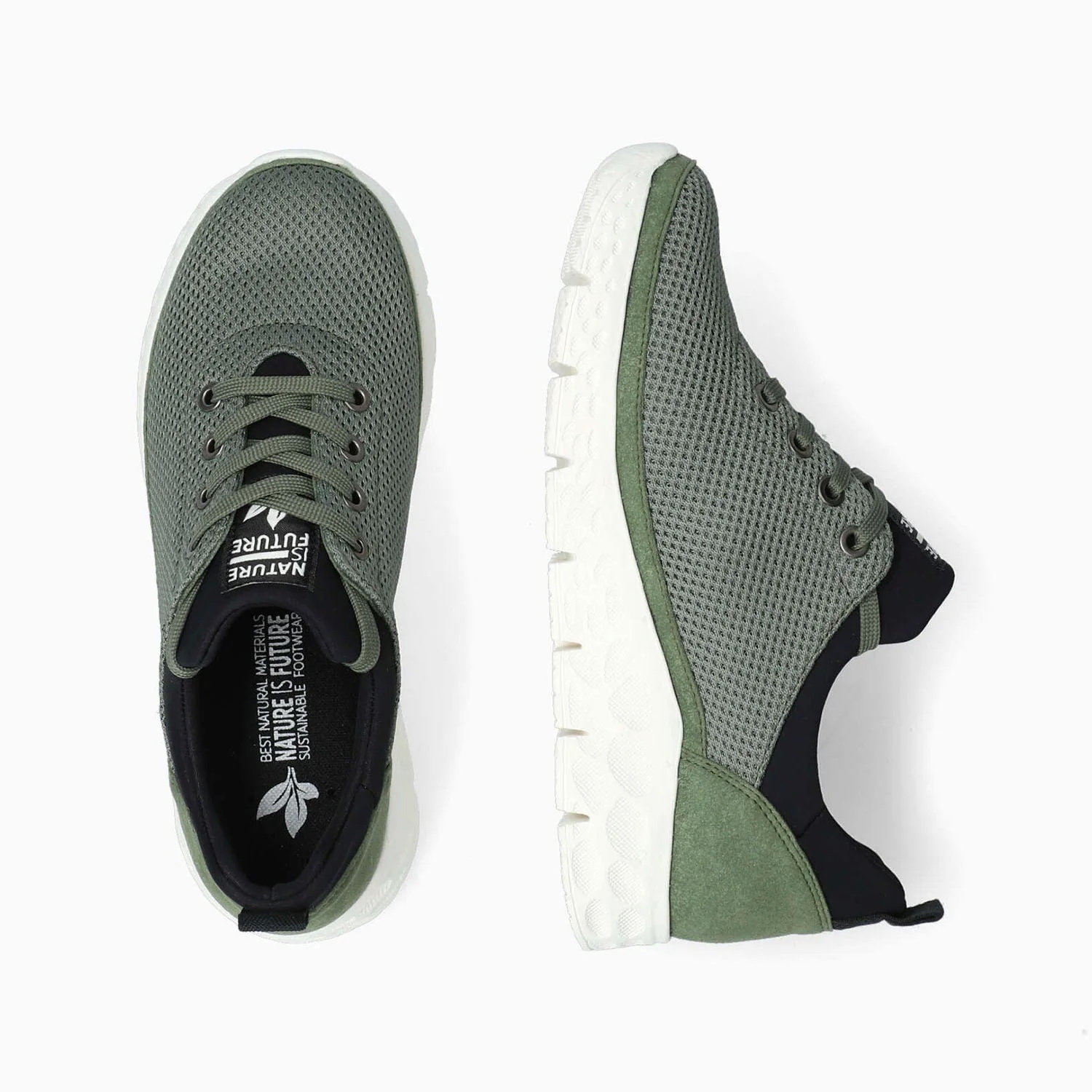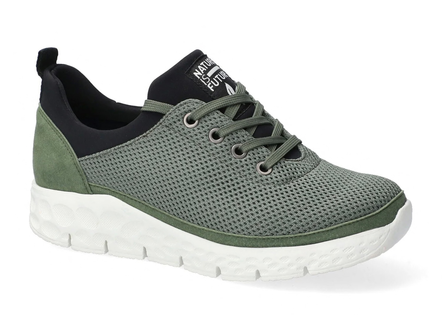 Was auch immer Ihre Outdoor-Aktivitäten sind, der Sneaker «Wing» ist zu allem bereit! Die überzeugende Passform, eine herausnehmbare Einlegesohle mit SOFT-AIR-Technologie und die elastische Außensohle sorgen für entspanntes Gehen. Von der erneuerbaren Sohle über das atmungsaktive Textilmaterial bis zu den Schnürsenkeln aus 100% recyceltem Polyester ist der Schuh ökologisch durchdacht. Bei der Produktion der langlebigen Sneaker werden recycelte Materialien eingesetzt, wo immer es möglich ist. Das Label «Nature is Future» steht für Transparenz in der Fertigung und 100% Made in Europe – vom Design bis zur lokalen Produktion. Dieses Modell ist auch für Frauen die unter Hallux valgus leiden geeignet. Da an der entsprechenden Stelle keine Naht entlang führt und der Schuh sehr weich ist, lässt sich dieser Schuh auch super angenehm mit Hallux tragen.