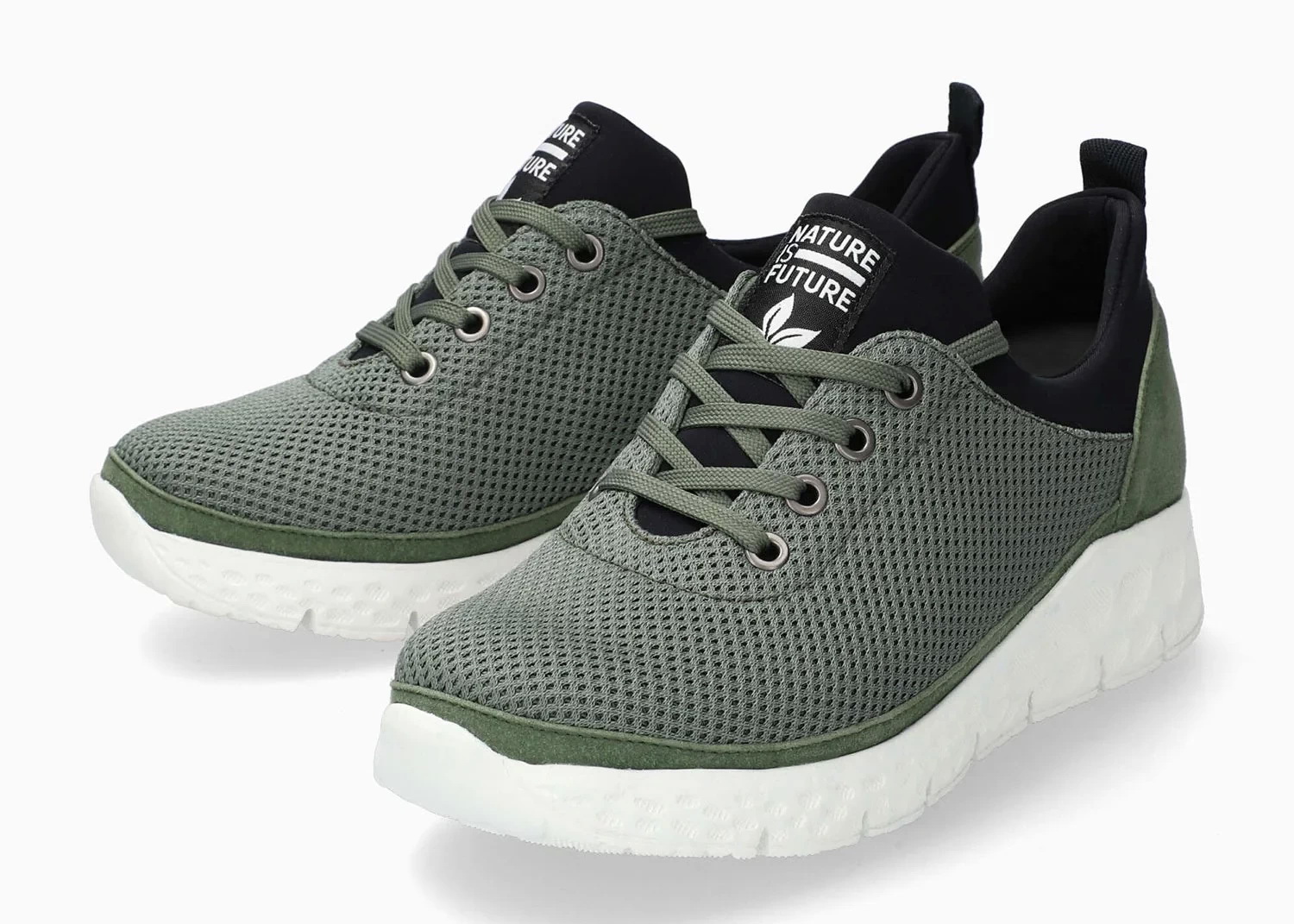 Bei der Produktion der langlebigen Sneaker werden recycelte Materialien eingesetzt, wo immer es möglich ist. Das Label «Nature is Future» steht für Transparenz in der Fertigung und 100% Made in Europe – vom Design bis zur lokalen Produktion.